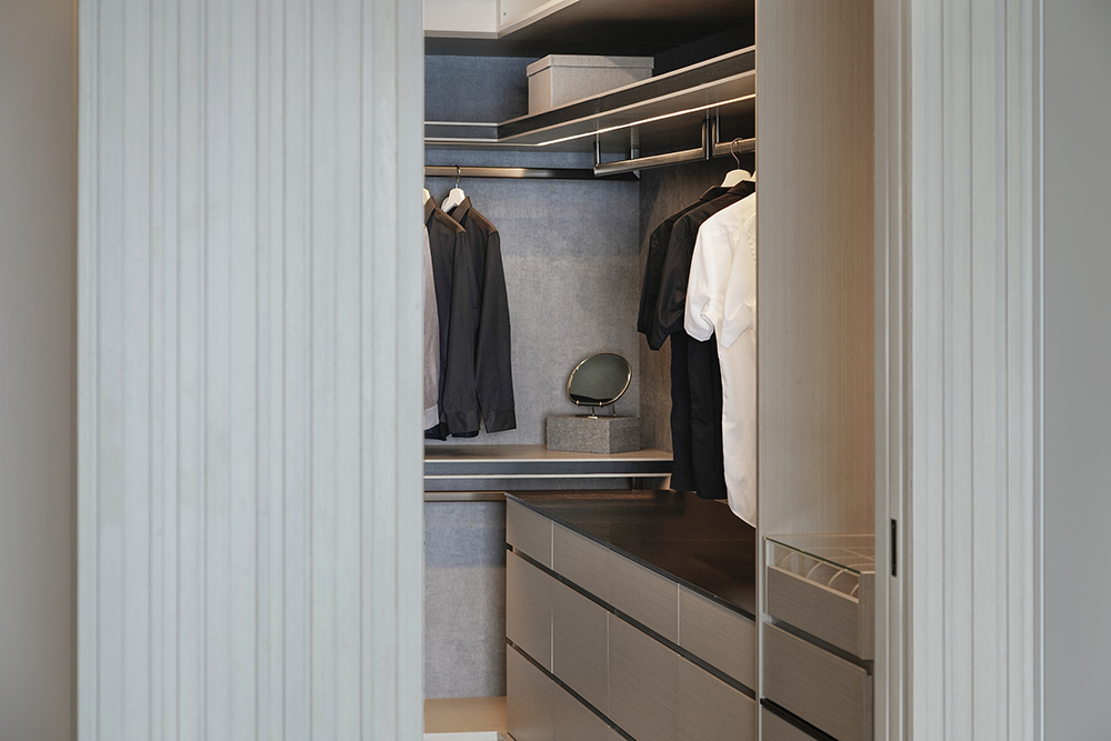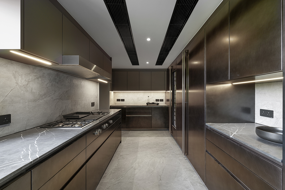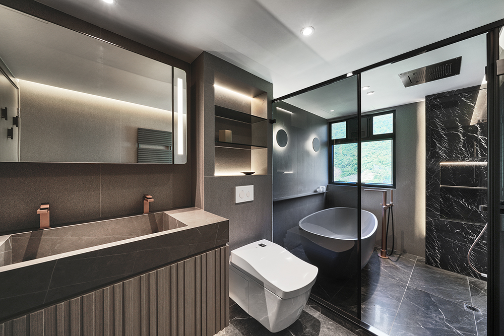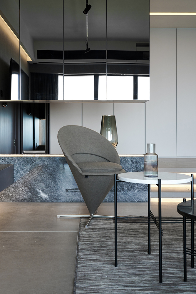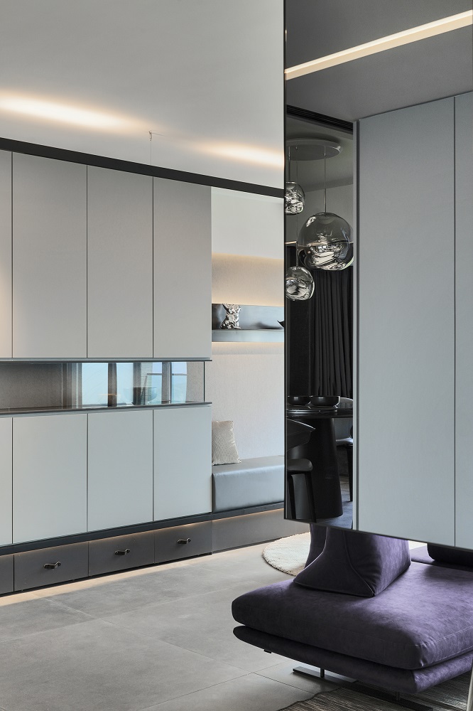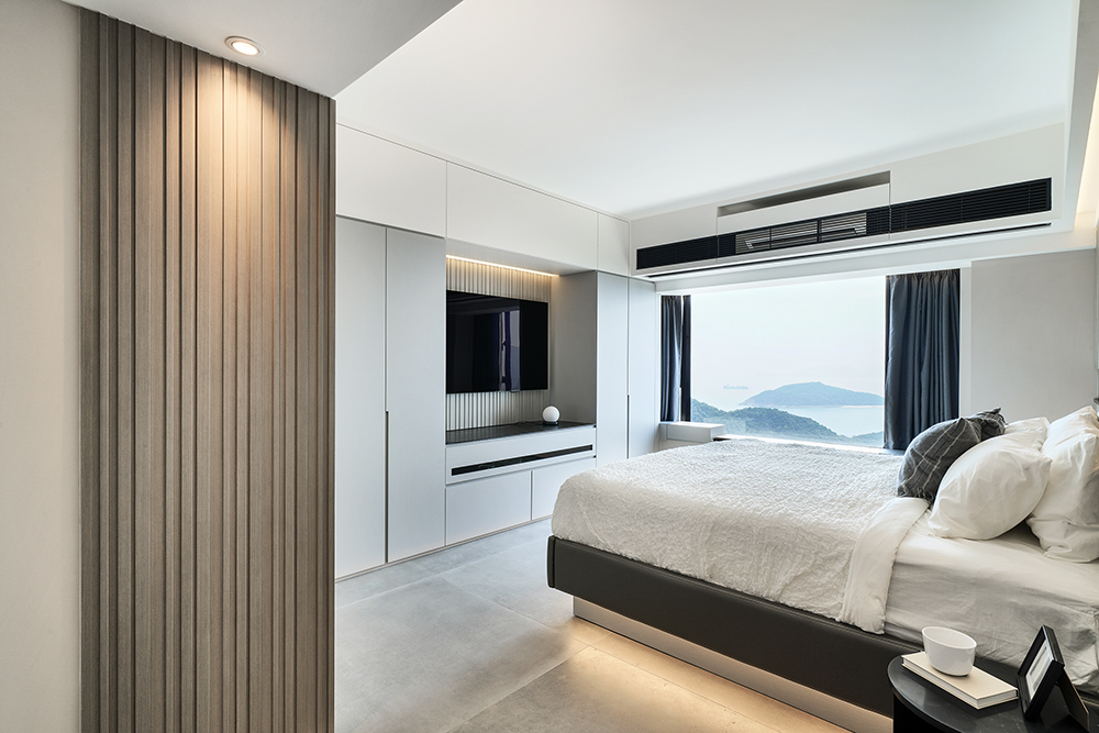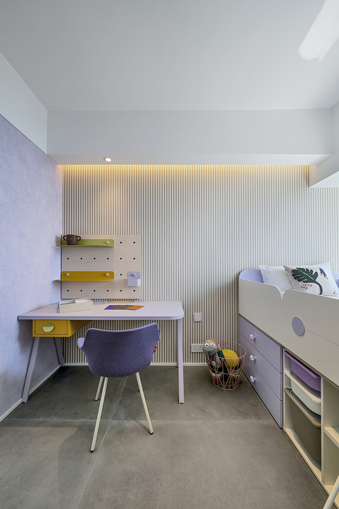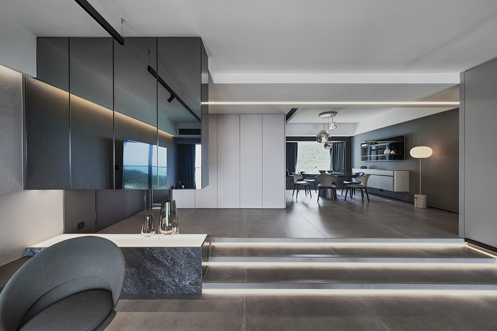 Residential design for a 2,400 sq. ft apartment, surrounded by a verdant scenery environment the open layout of the dining and living area along with the large windows fully takes advantage of the abundance of natural light. Dominated by the gray color, using paint, wallpaper, veneer, and fabric to match with natural stone. The wood paneling and the color selection of loose furniture have added a sense of warmth to create a harmonious atmosphere in the space. Thematic wallpaper, colorful dot handles, and feature tiles are used in the two children's bedrooms and bathroom to infuse something energetic and fun in the space.