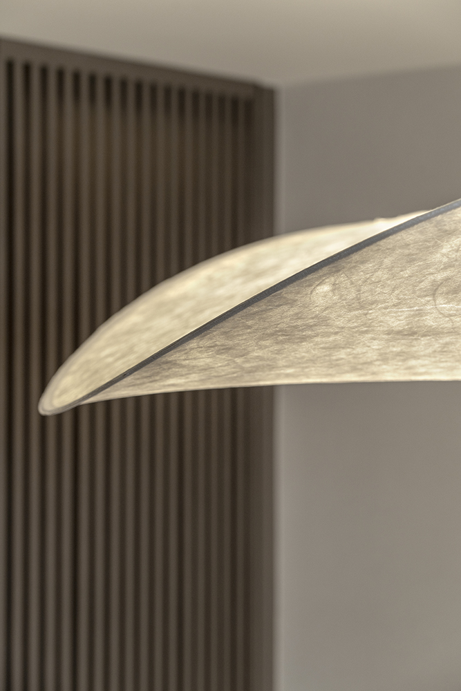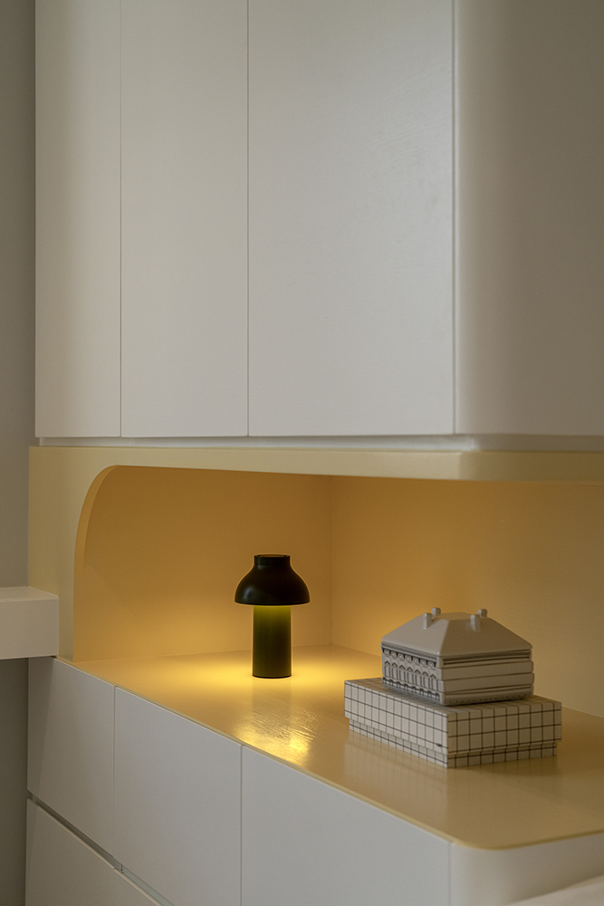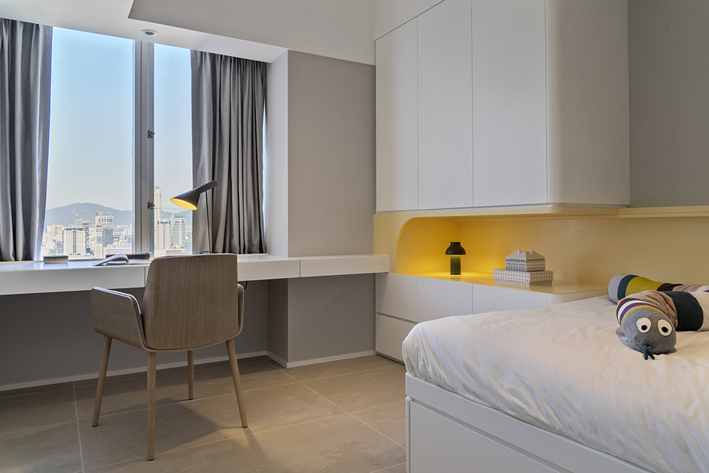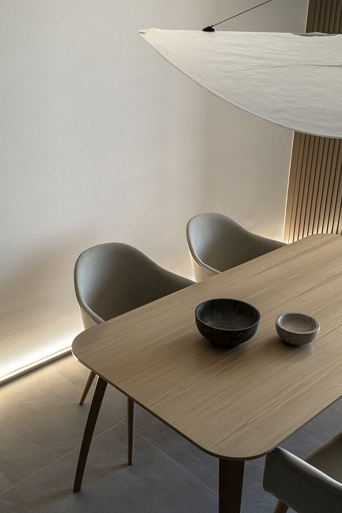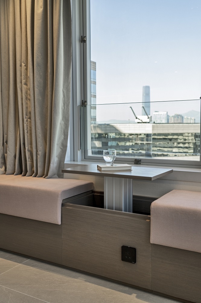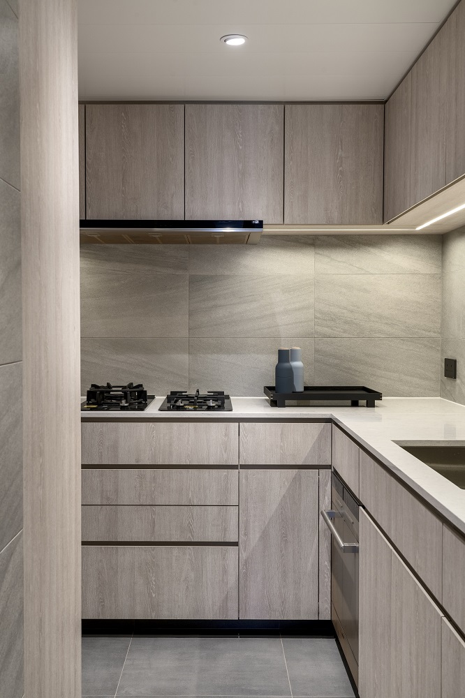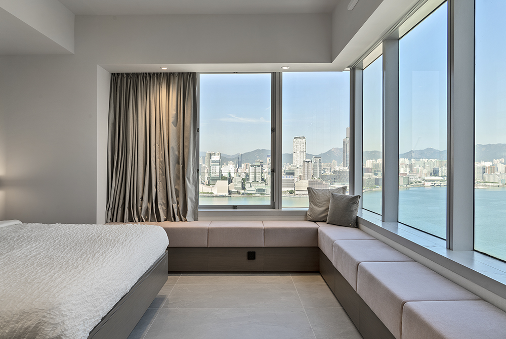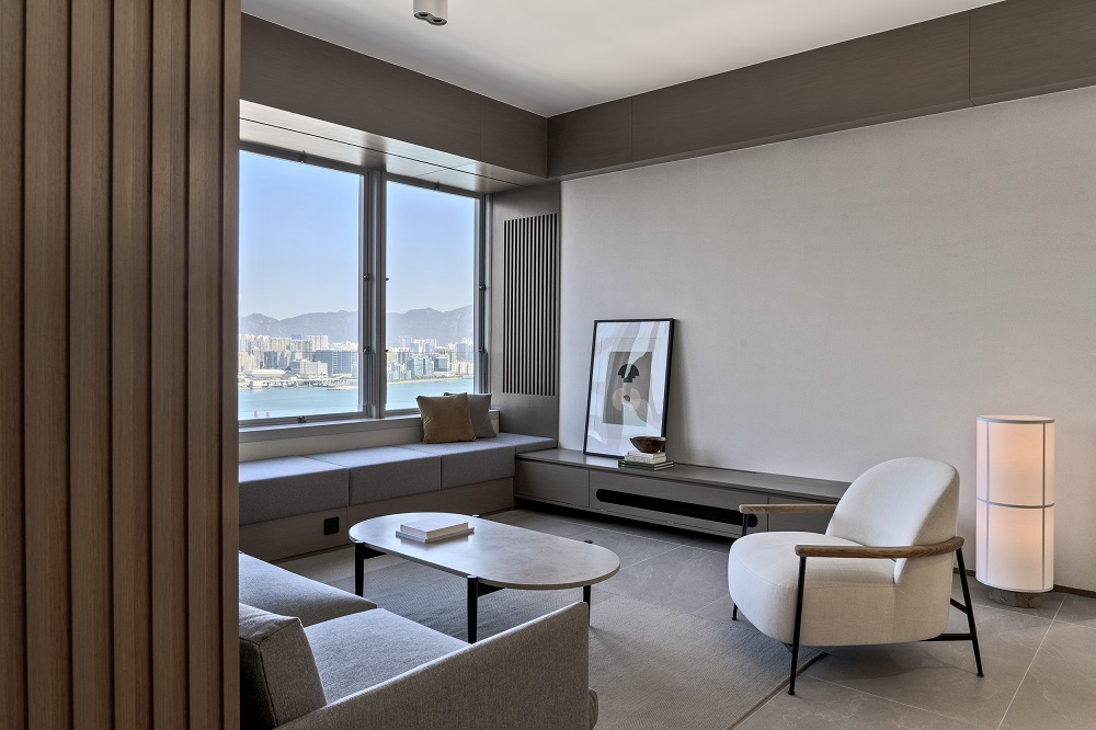 Residential design is inspired by the Japanese aesthetic, in praises of shadows between objects, deep stillness floating in the air creates a vibe to let go of the pressure and live in harmony with the contemporary space. These zen feelings came along with the wooden partitions and ceiling in the foyer and living room. The stunning view of Victoria harbor further emphasized a welcoming open space to relax and unwind. Woods and feature glass blended with their own unique ripples and subtle tones for the coherence of simplicity. The feature glass looks kind of hazy but allows light to pass through the glass into the kitchen and cloakroom where it does not have natural light sources, making the space brighter and open.