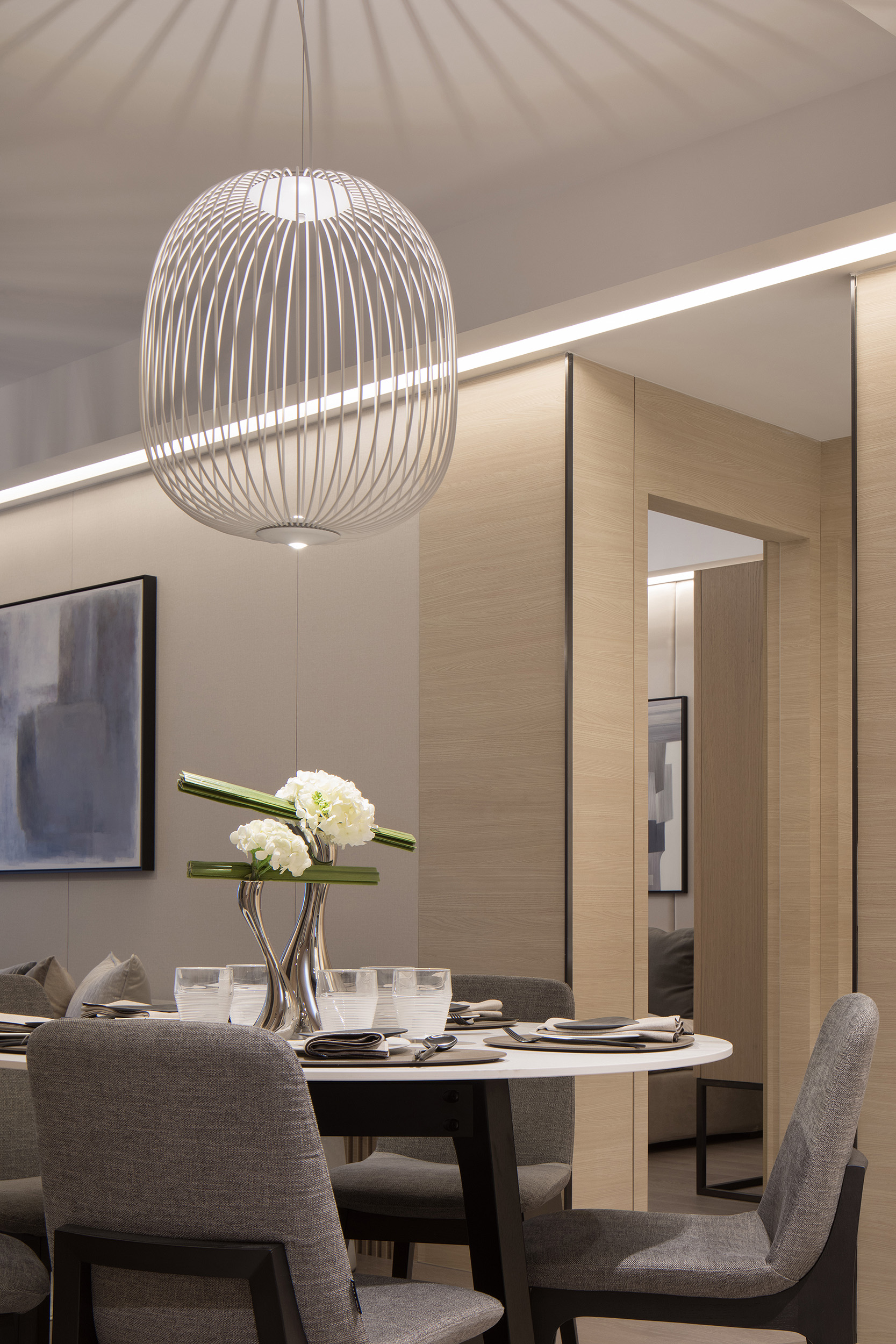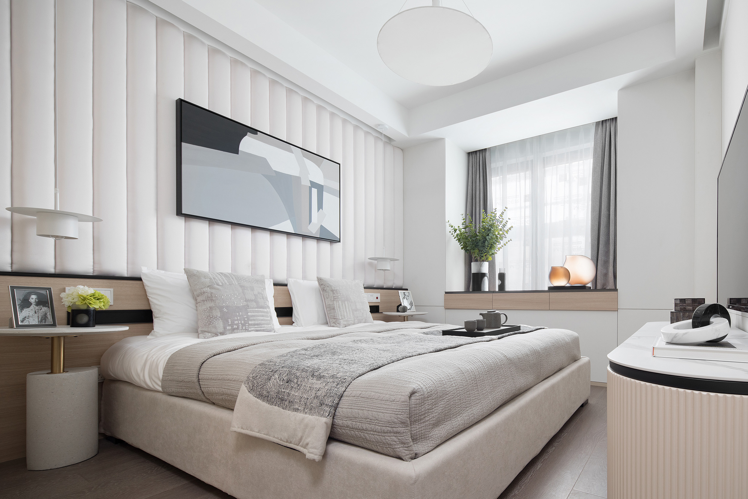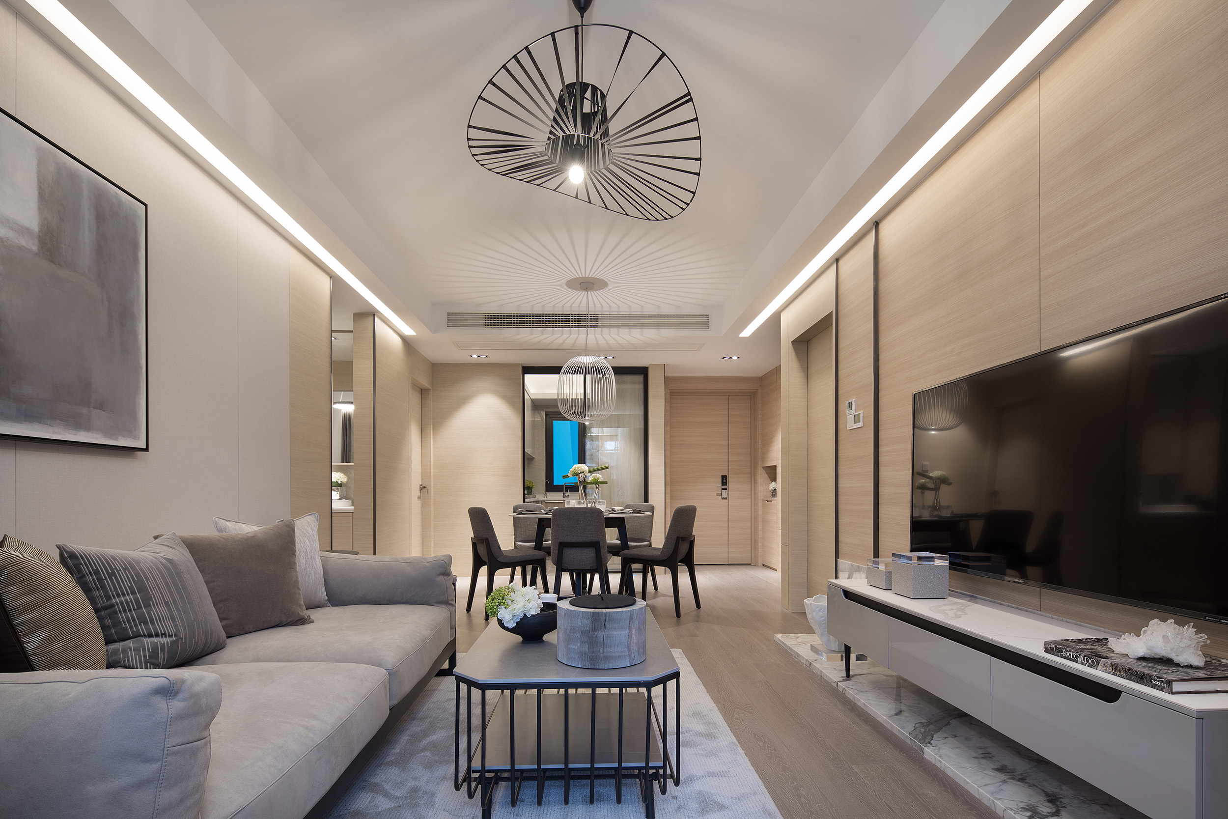 Showflat was designed for the Shanghai Parkview Garden, with the aim to design an elegant and fresh apartment by using a light wooden floor and a simple white tone. This fundamental hue is lined with warm gray wallpaper, and a light woody tone to create a calming experience at home. The entrance and the living and dining room face the large windows indoors, and abundant natural light floods every space, making the interior bright and transparent. Coupled with simple light gray curtains, the space is comfortable and warm without the slightest sense of oppression.
