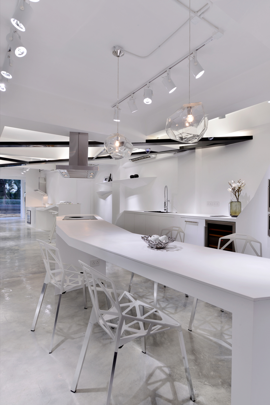 The interior is a reflection of the products themselves. We are inspired by the unique choices of materials, color and shape of the product’s award-winning design. An irregular geometry is the center of the design which used to highlight the lines and technology of the products.