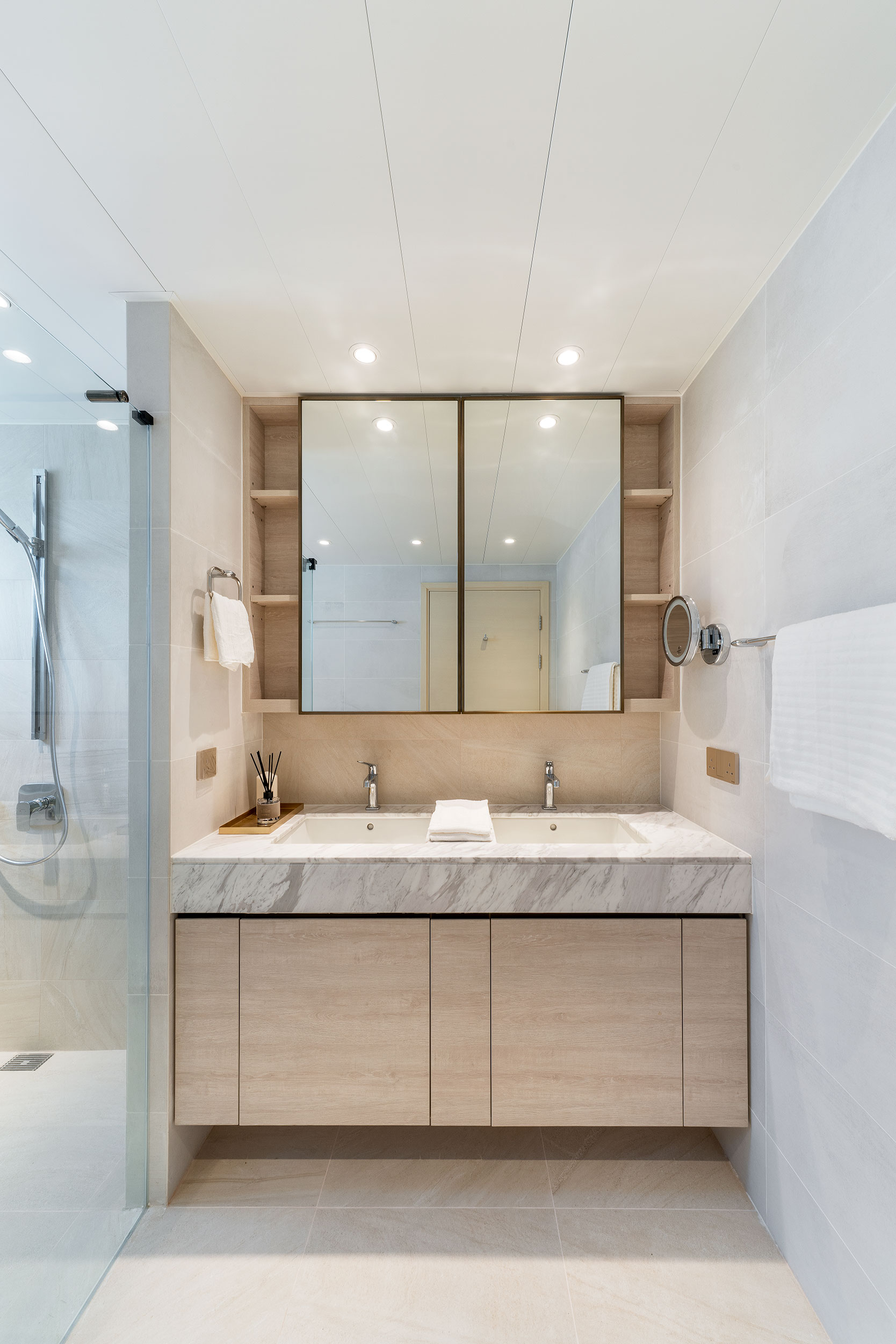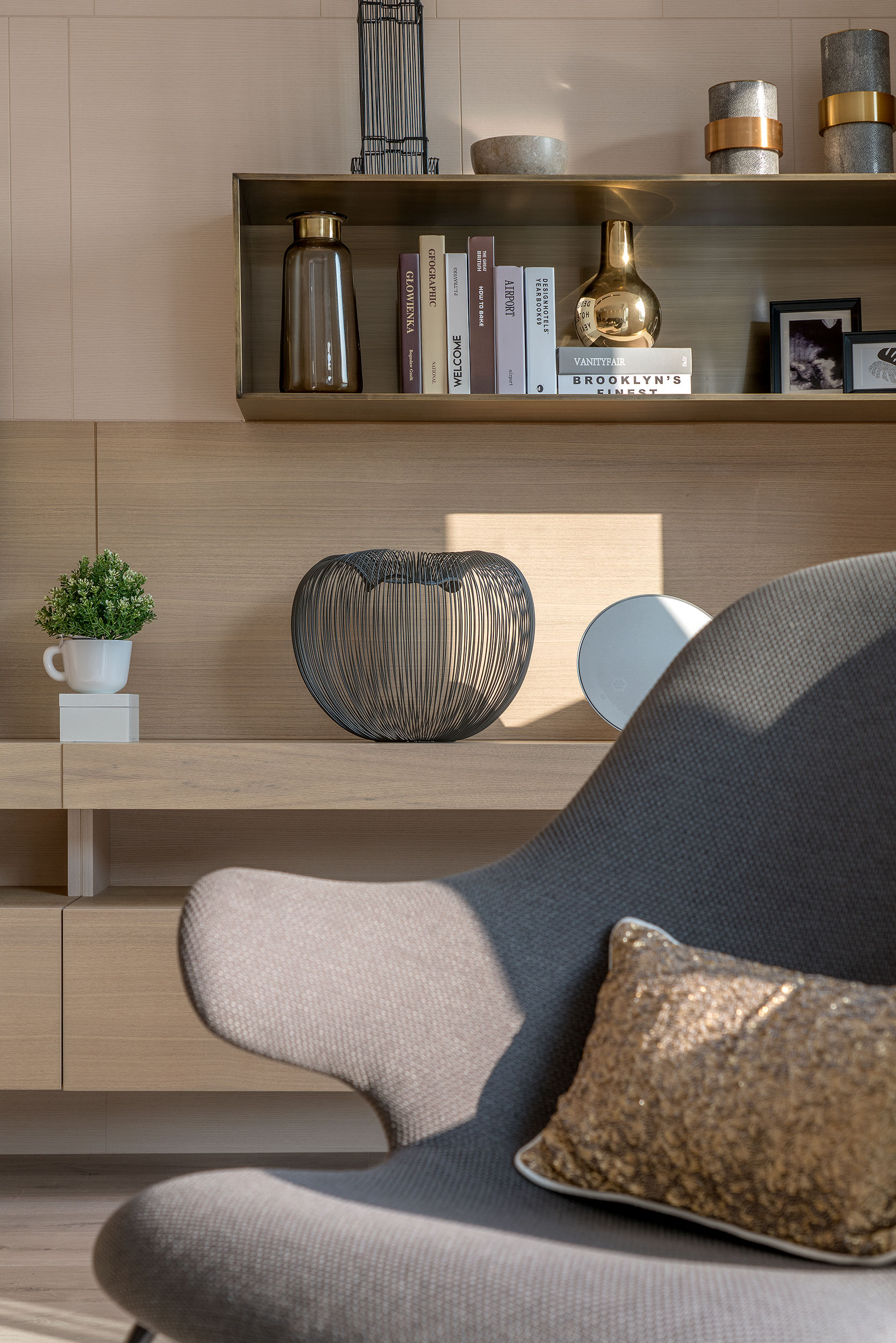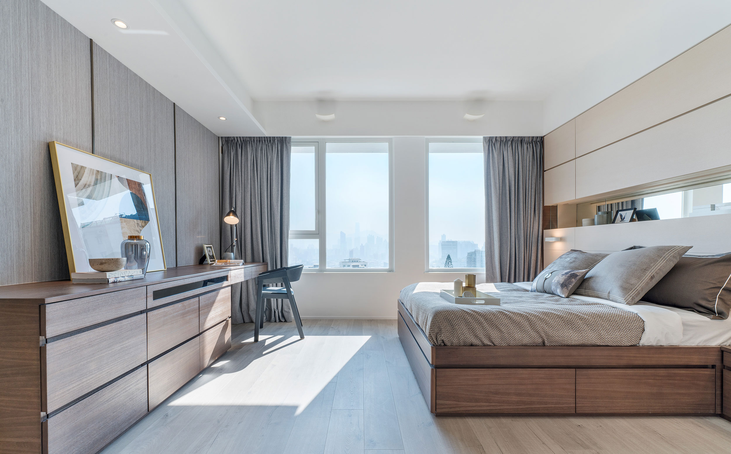 As the owner is a newly retired couple who enjoys art collecting, the design is especially considered for their living after their retirement while designing a stress-free atmosphere. The apartment consists of 2 bedrooms, 2 bathrooms, 1 study room, and a kitchen. Taking into account the space requirements of the two after their retirement and their collection of artworks, the designer reserved a wider aisle distance, and built the display and storage unit along the living room, corridor to the bedrooms, maximizing the use of space and remaining spacious.