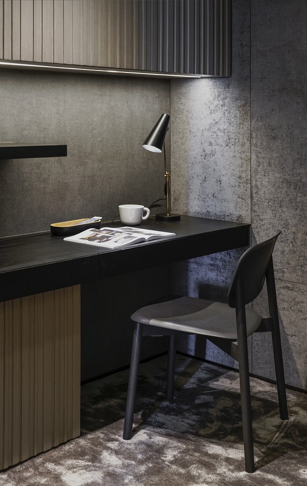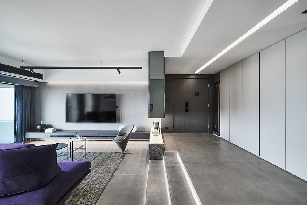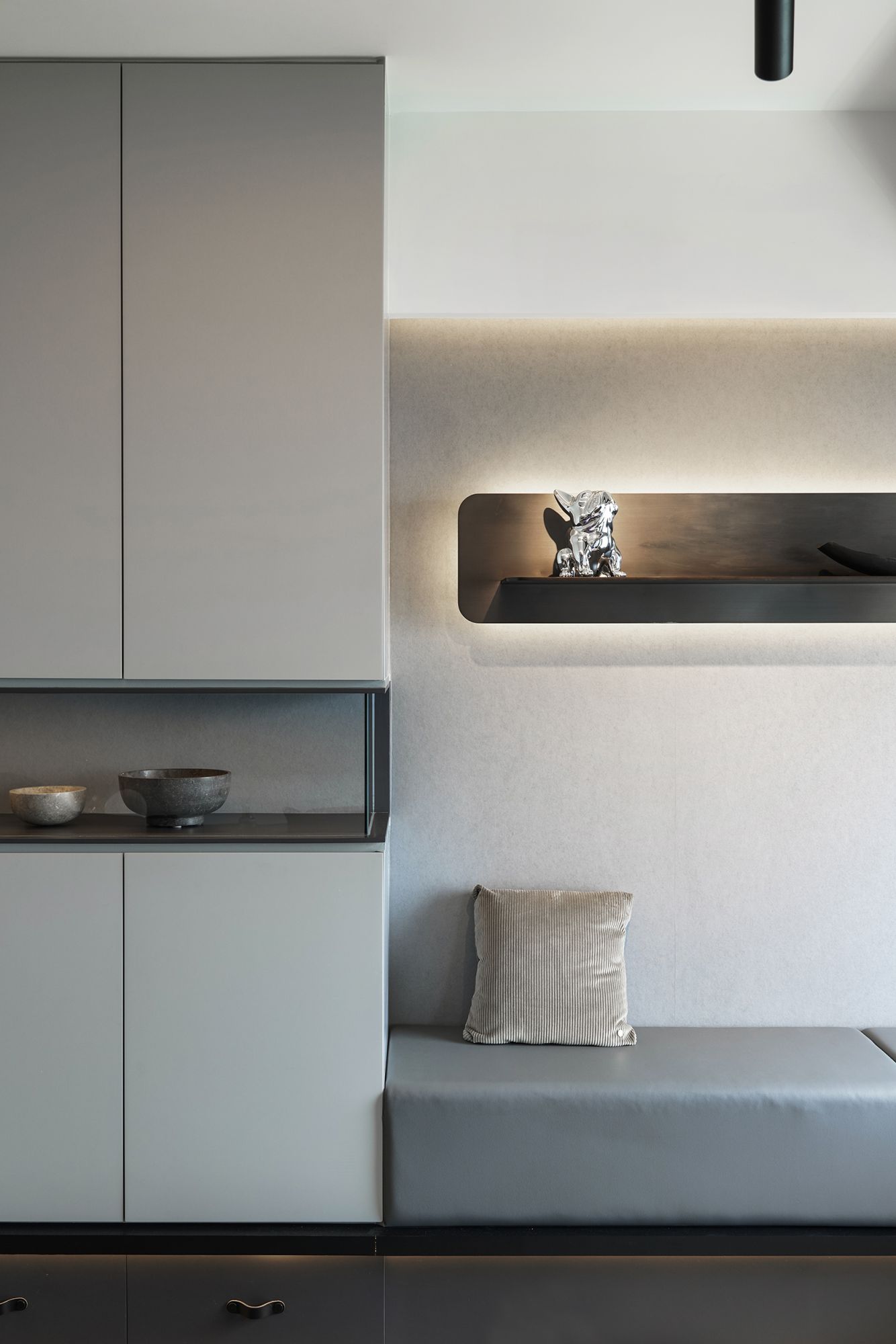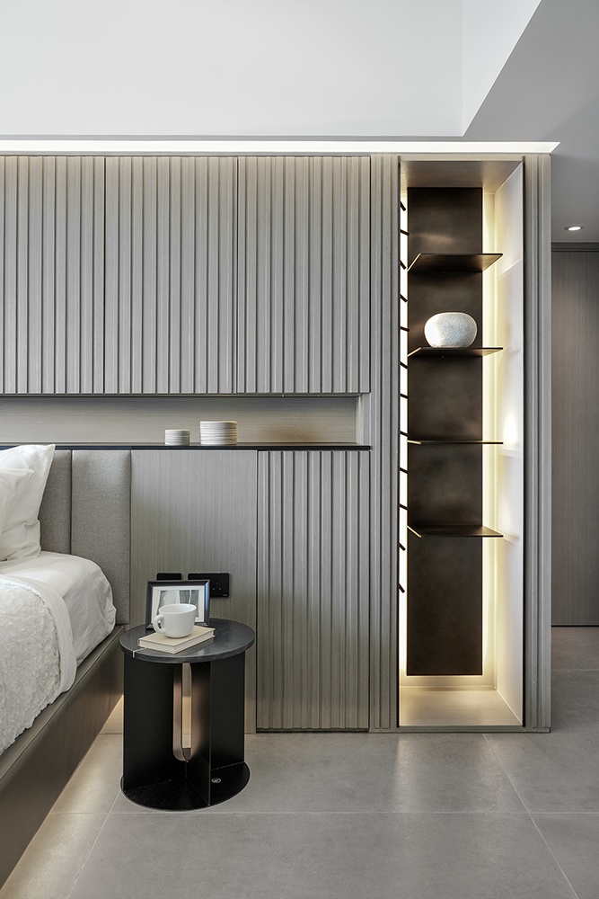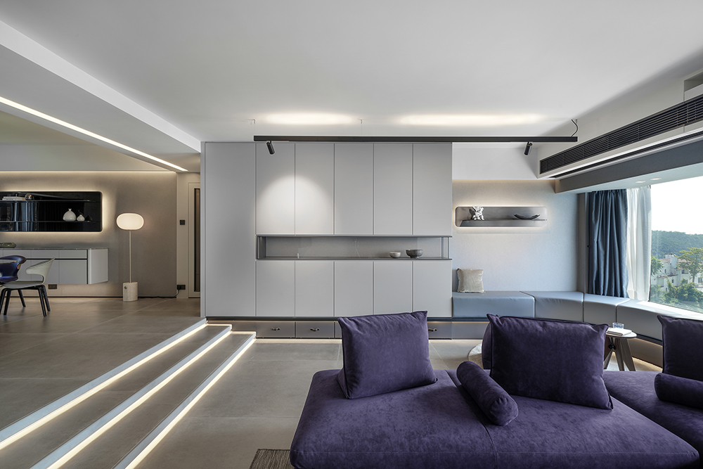 Residential design for a 2,400 sq. ft apartment, surrounded by a verdant scenery environment the open layout of the dining and living area along with the large windows fully takes advantage of the abundance of natural light. Dominated by the gray color, using paint, wallpaper, veneer, and fabric to match with natural stone. The wood paneling and the color selection of loose furniture have added a sense of warmth to create a harmonious atmosphere in the space. Thematic wallpaper, colorful dot handles, and feature tiles are used in the two children's bedrooms and bathroom to infuse something energetic and fun in the space.