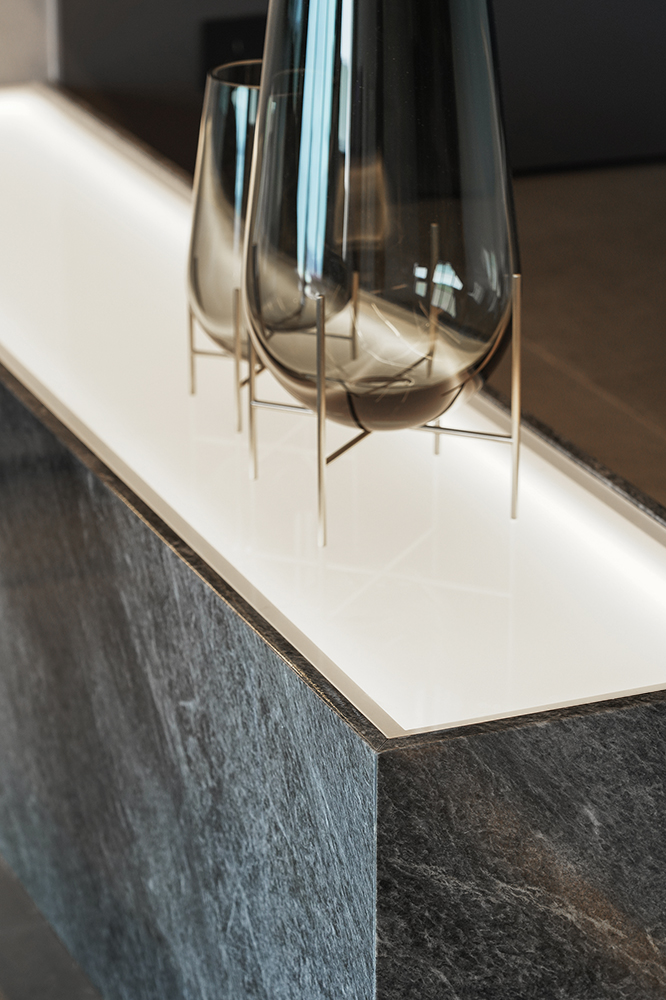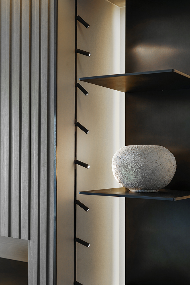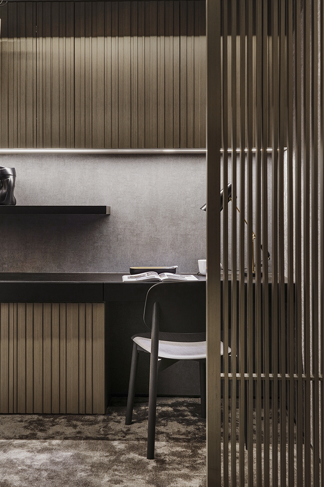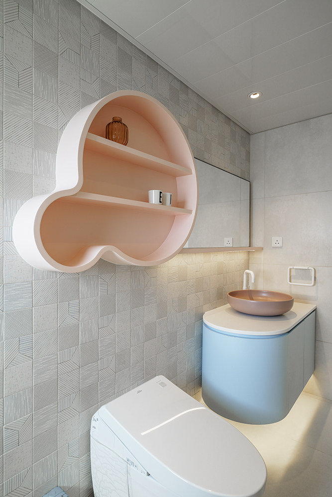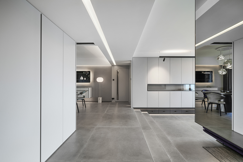 Residential design for a 2,400 sq. ft apartment, surrounded by a verdant scenery environment the open layout of the dining and living area along with the large windows fully takes advantage of the abundance of natural light. Dominated by the gray color, using paint, wallpaper, veneer, and fabric to match with natural stone. The wood paneling and the color selection of loose furniture have added a sense of warmth to create a harmonious atmosphere in the space. Thematic wallpaper, colorful dot handles, and feature tiles are used in the two children's bedrooms and bathroom to infuse something energetic and fun in the space.