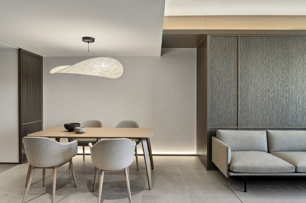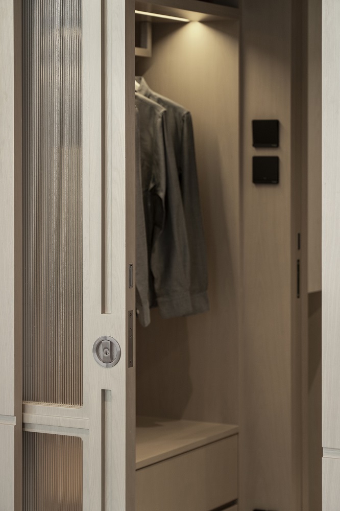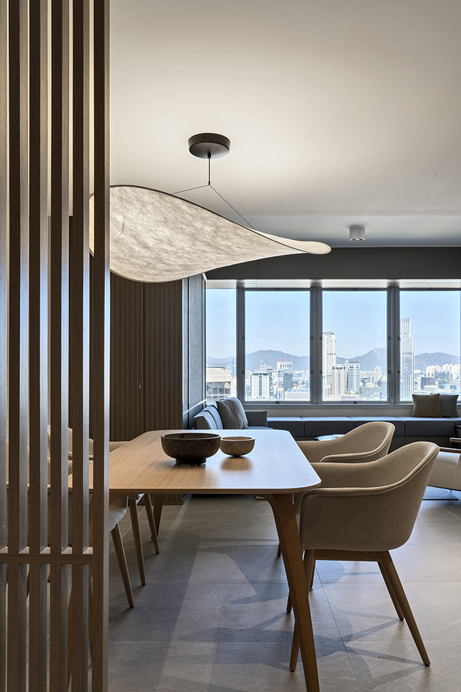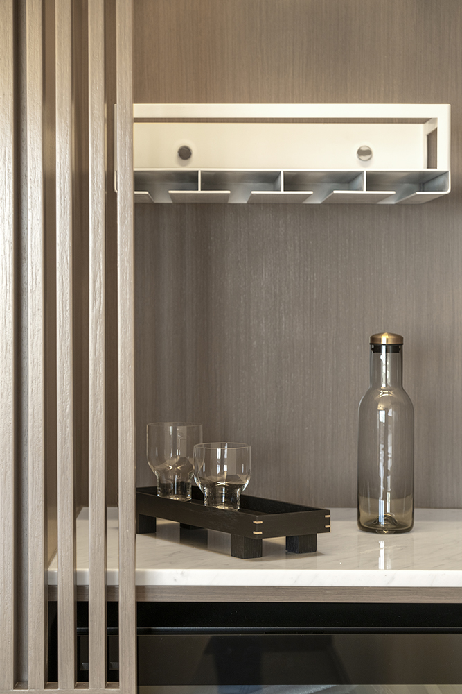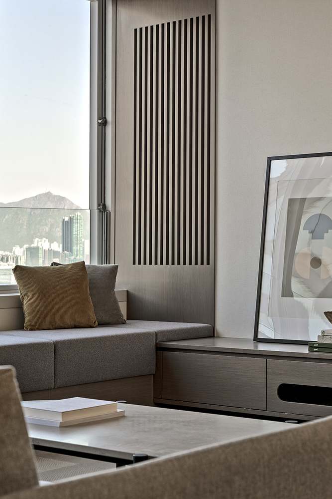 Residential design is inspired by the Japanese aesthetic, in praises of shadows between objects, deep stillness floating in the air creates a vibe to let go of the pressure and live in harmony with the contemporary space. These zen feelings came along with the wooden partitions and ceiling in the foyer and living room. The stunning view of Victoria harbor further emphasized a welcoming open space to relax and unwind. Woods and feature glass blended with their own unique ripples and subtle tones for the coherence of simplicity. The feature glass looks kind of hazy but allows light to pass through the glass into the kitchen and cloakroom where it does not have natural light sources, making the space brighter and open.