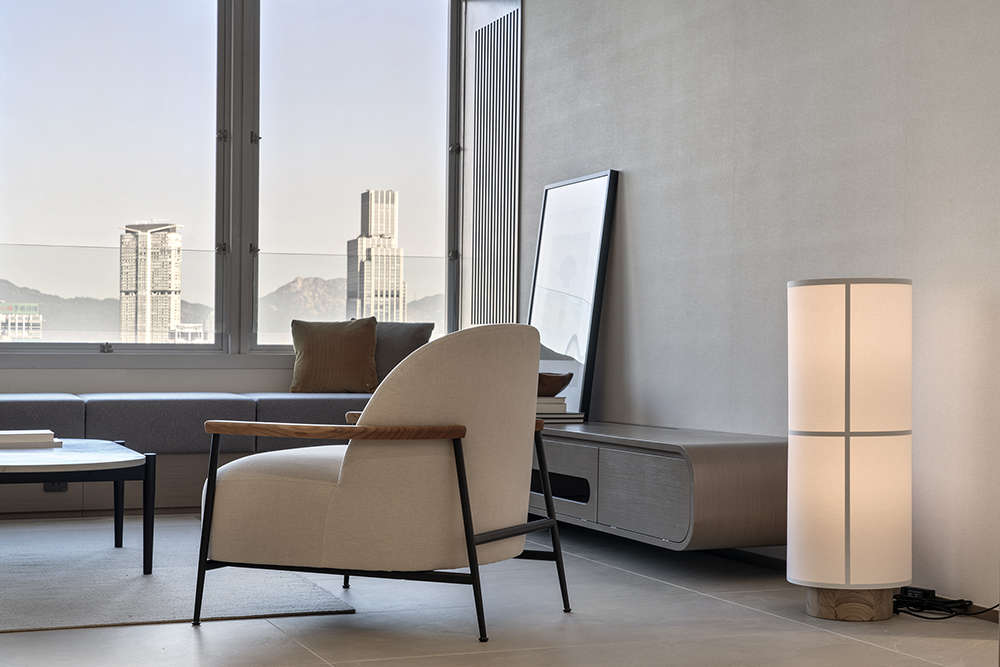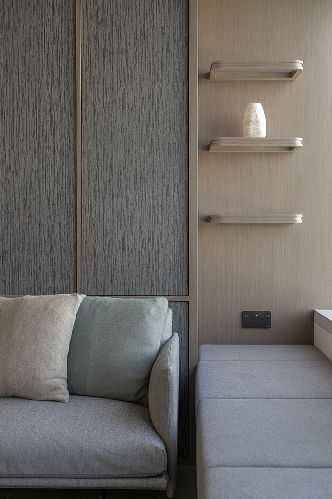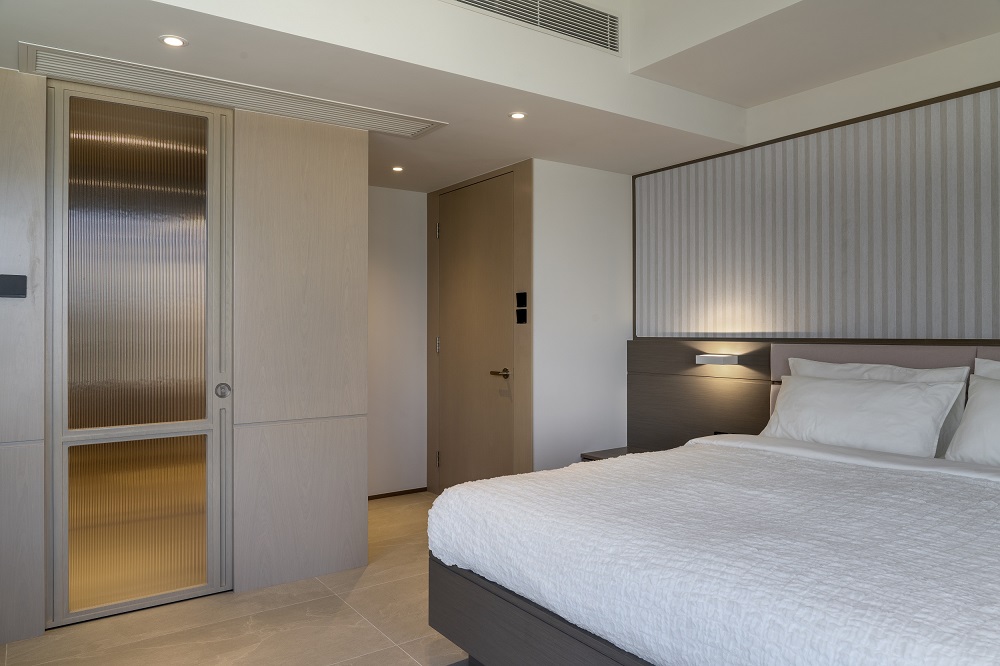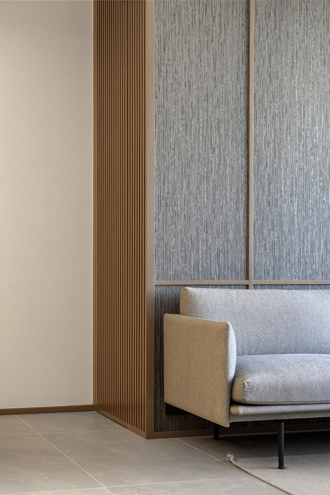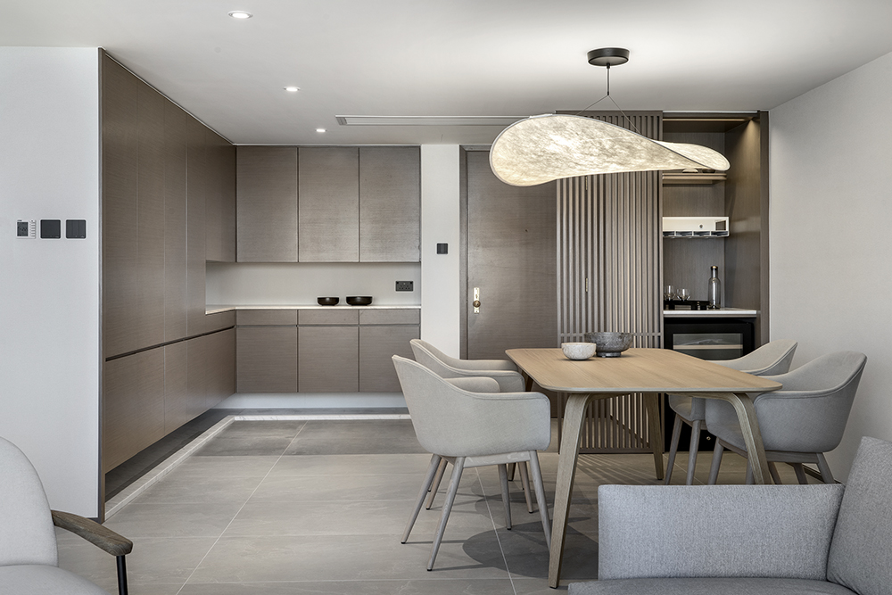 Residential design is inspired by the Japanese aesthetic, in praises of shadows between objects, deep stillness floating in the air creates a vibe to let go of the pressure and live in harmony with the contemporary space. These zen feelings came along with the wooden partitions and ceiling in the foyer and living room. The stunning view of Victoria harbor further emphasized a welcoming open space to relax and unwind. Woods and feature glass blended with their own unique ripples and subtle tones for the coherence of simplicity. The feature glass looks kind of hazy but allows light to pass through the glass into the kitchen and cloakroom where it does not have natural light sources, making the space brighter and open.