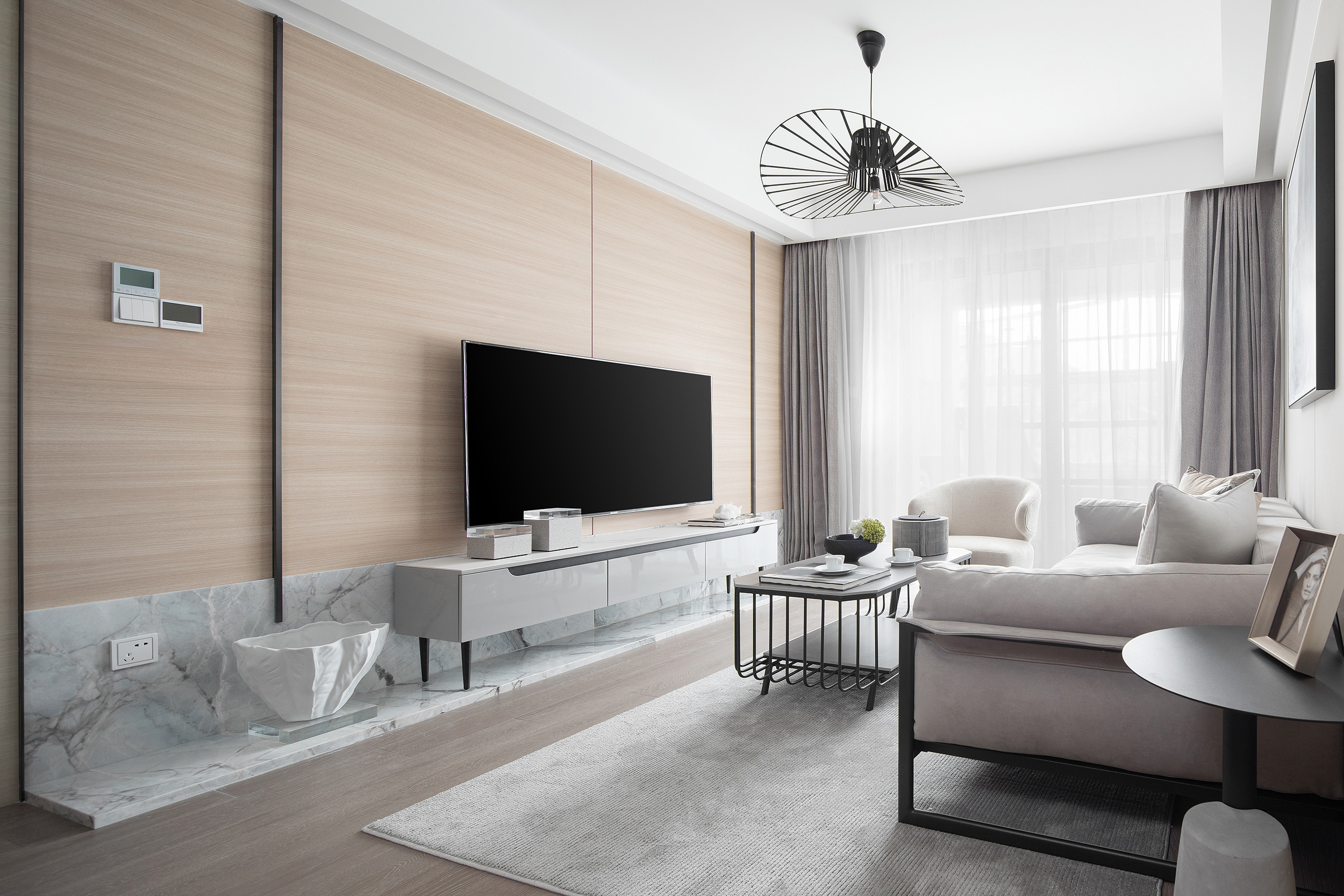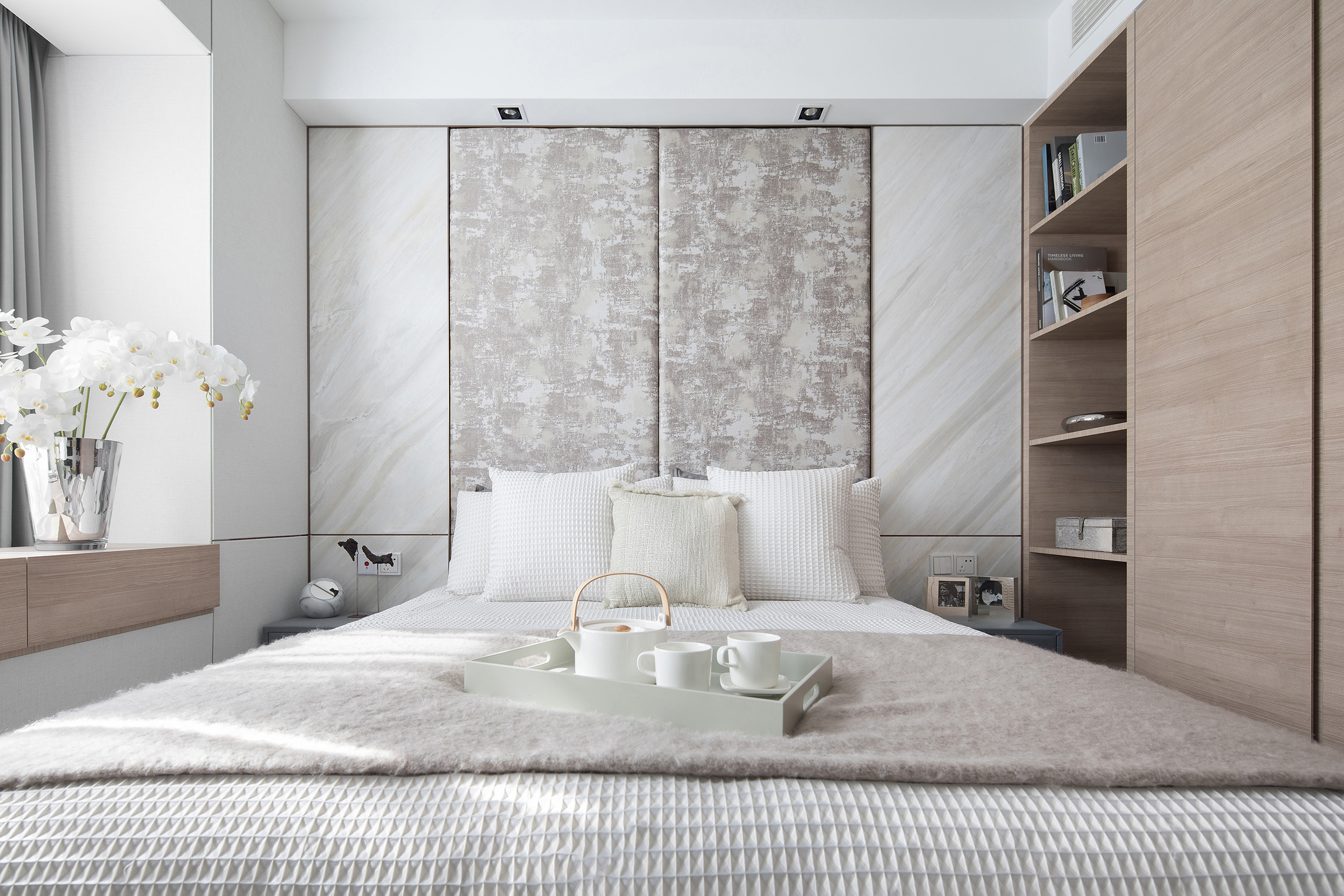 Showflat was designed for the Shanghai Parkview Garden, with the aim to design an elegant and fresh apartment by using a light wooden floor and a simple white tone. This fundamental hue is lined with warm gray wallpaper, and a light woody tone to create a calming experience at home. The entrance and the living and dining room face the large windows indoors, and abundant natural light floods every space, making the interior bright and transparent. Coupled with simple light gray curtains, the space is comfortable and warm without the slightest sense of oppression.