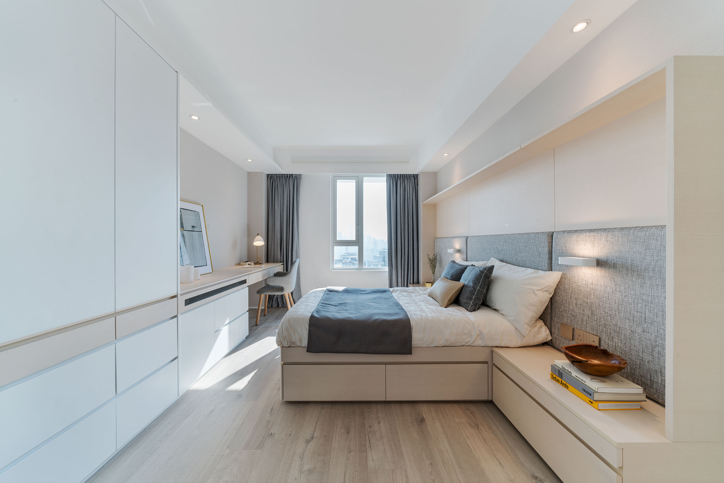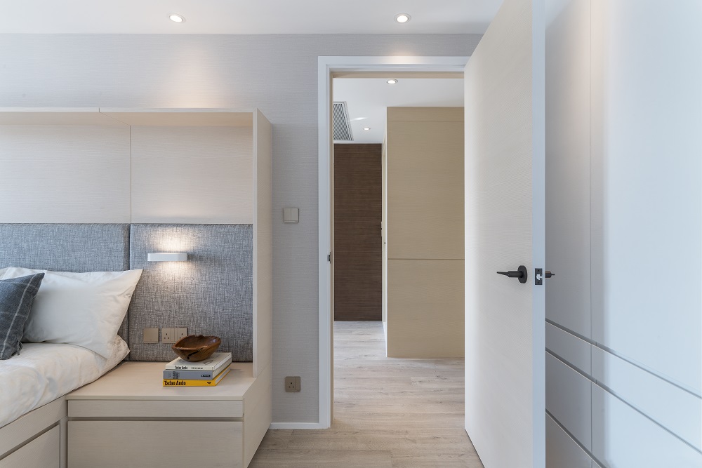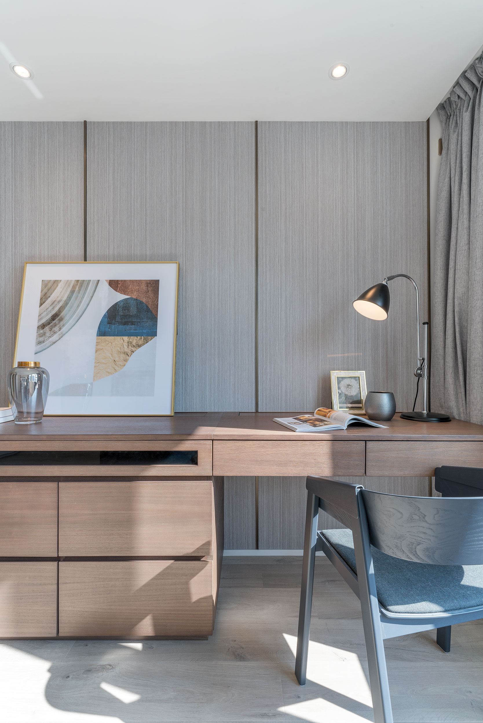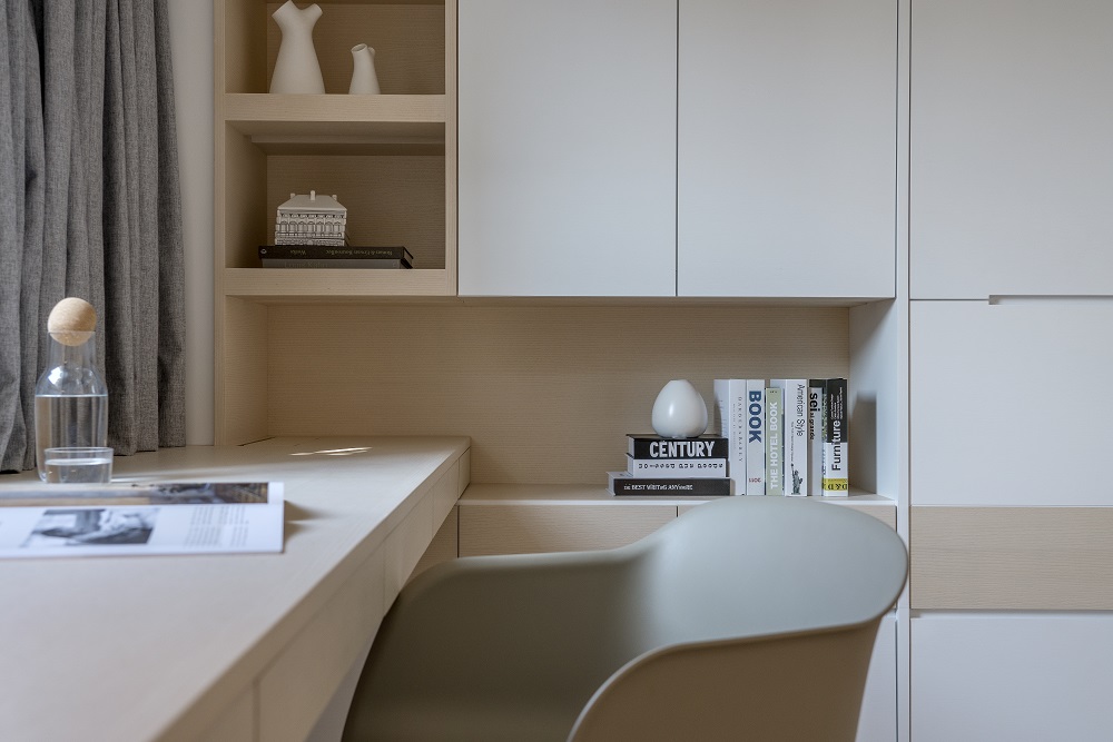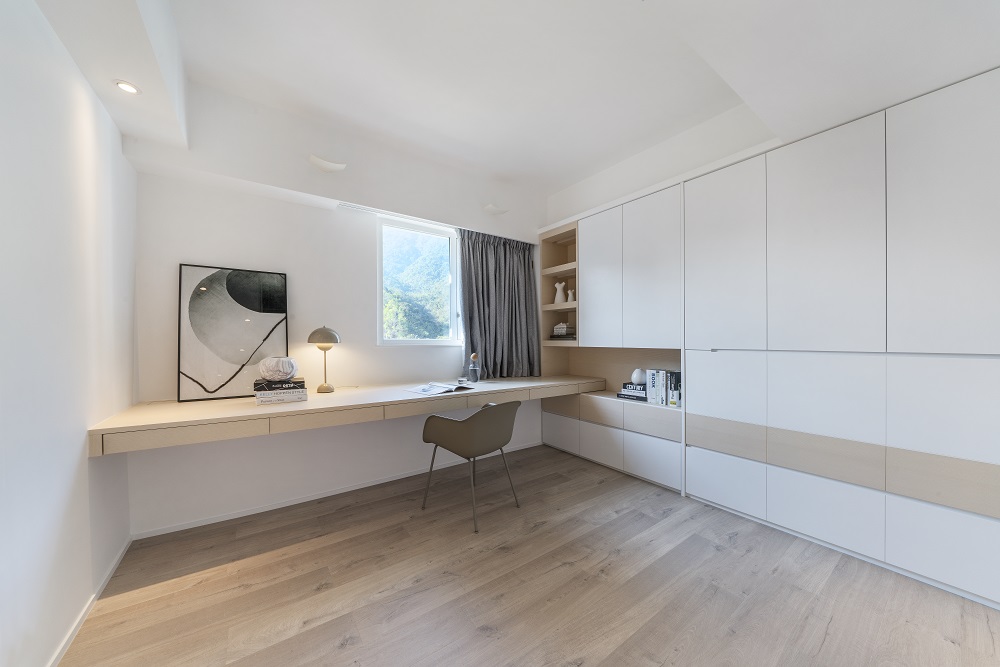 As the owner is a newly retired couple who enjoys art collecting, the design is especially considered for their living after their retirement while designing a stress-free atmosphere. The apartment consists of 2 bedrooms, 2 bathrooms, 1 study room, and a kitchen. Taking into account the space requirements of the two after their retirement and their collection of artworks, the designer reserved a wider aisle distance, and built the display and storage unit along the living room, corridor to the bedrooms, maximizing the use of space and remaining spacious.