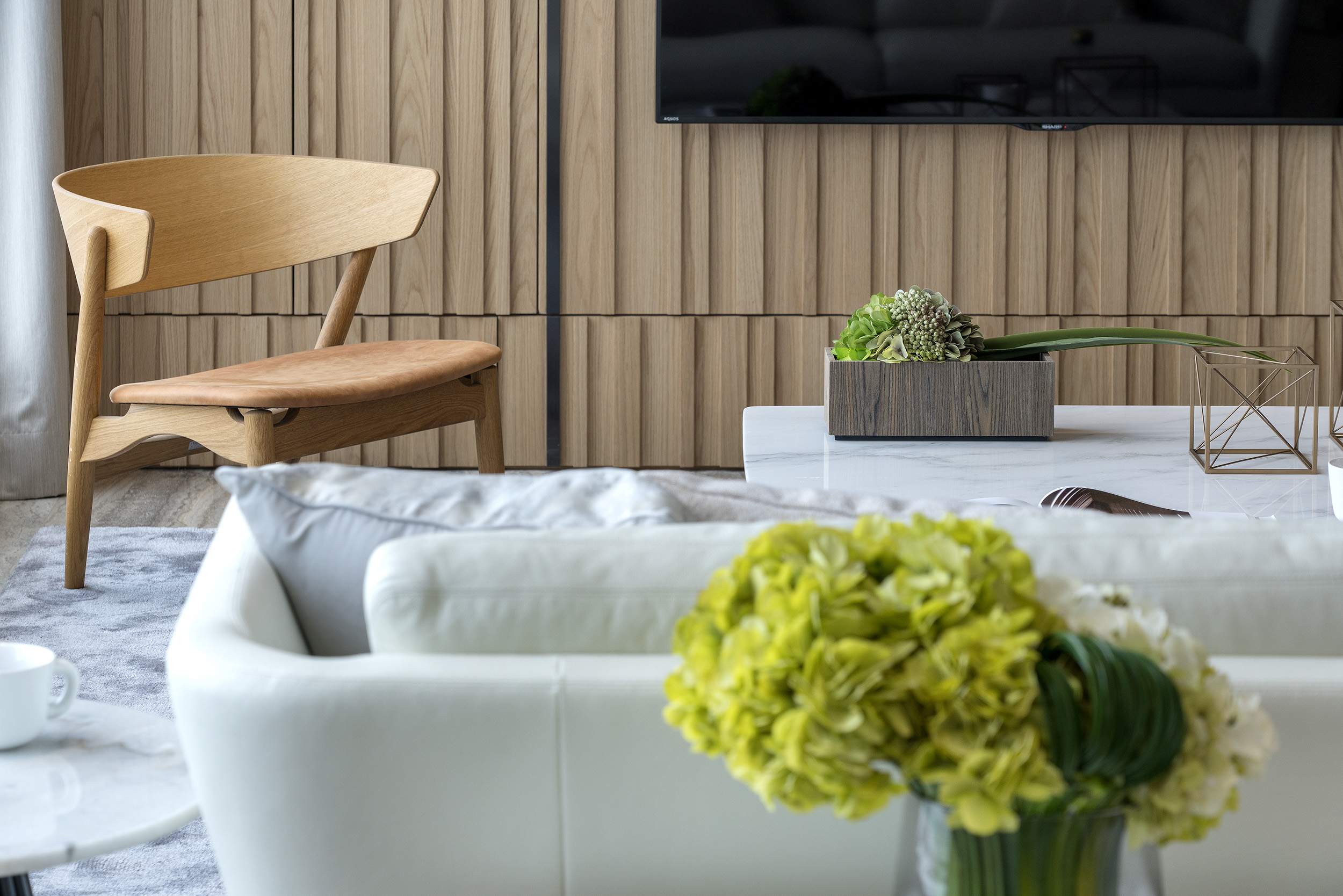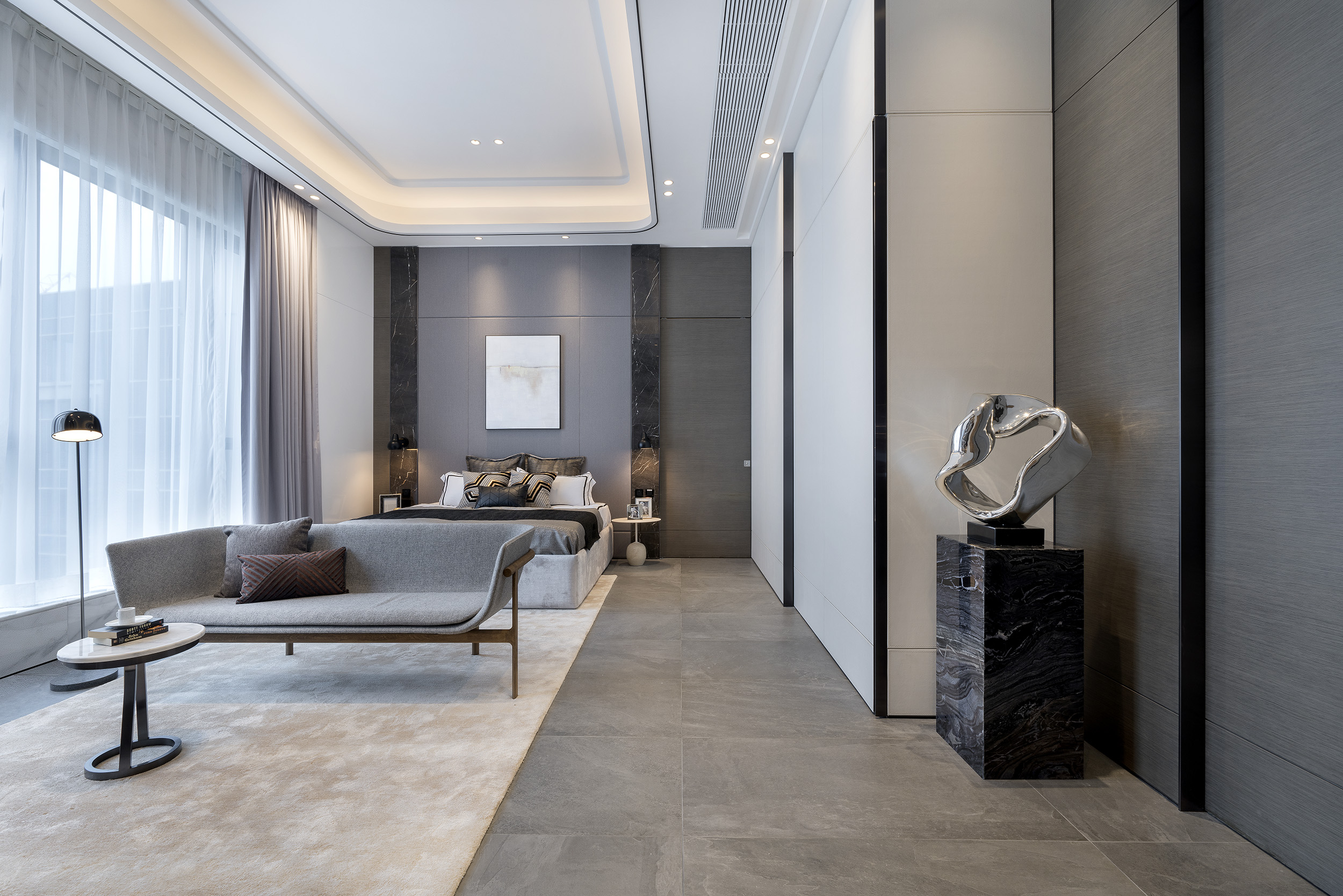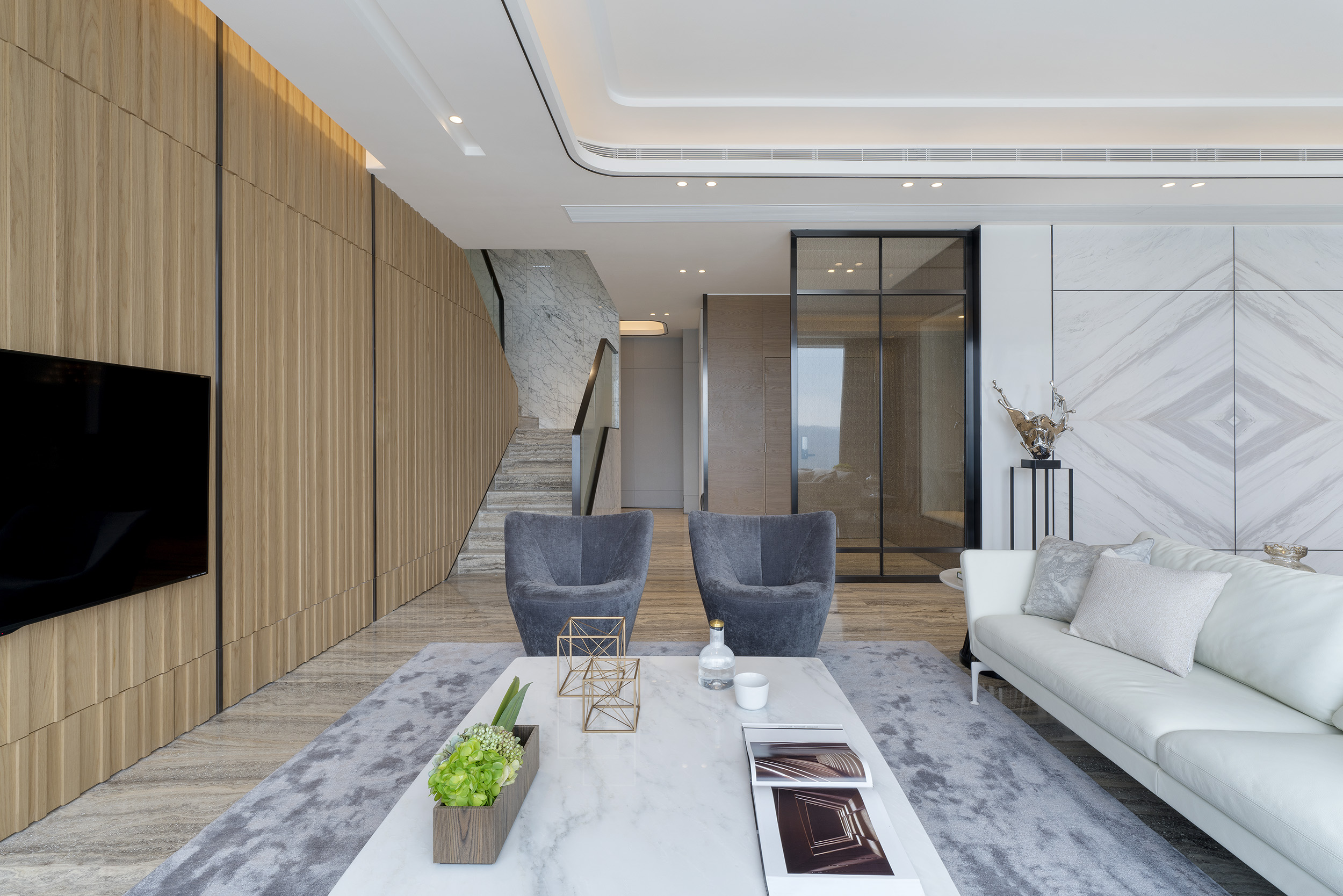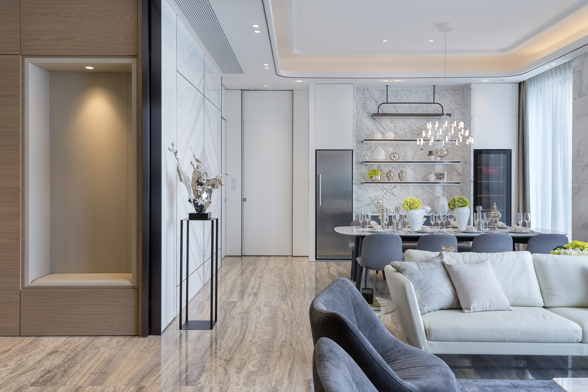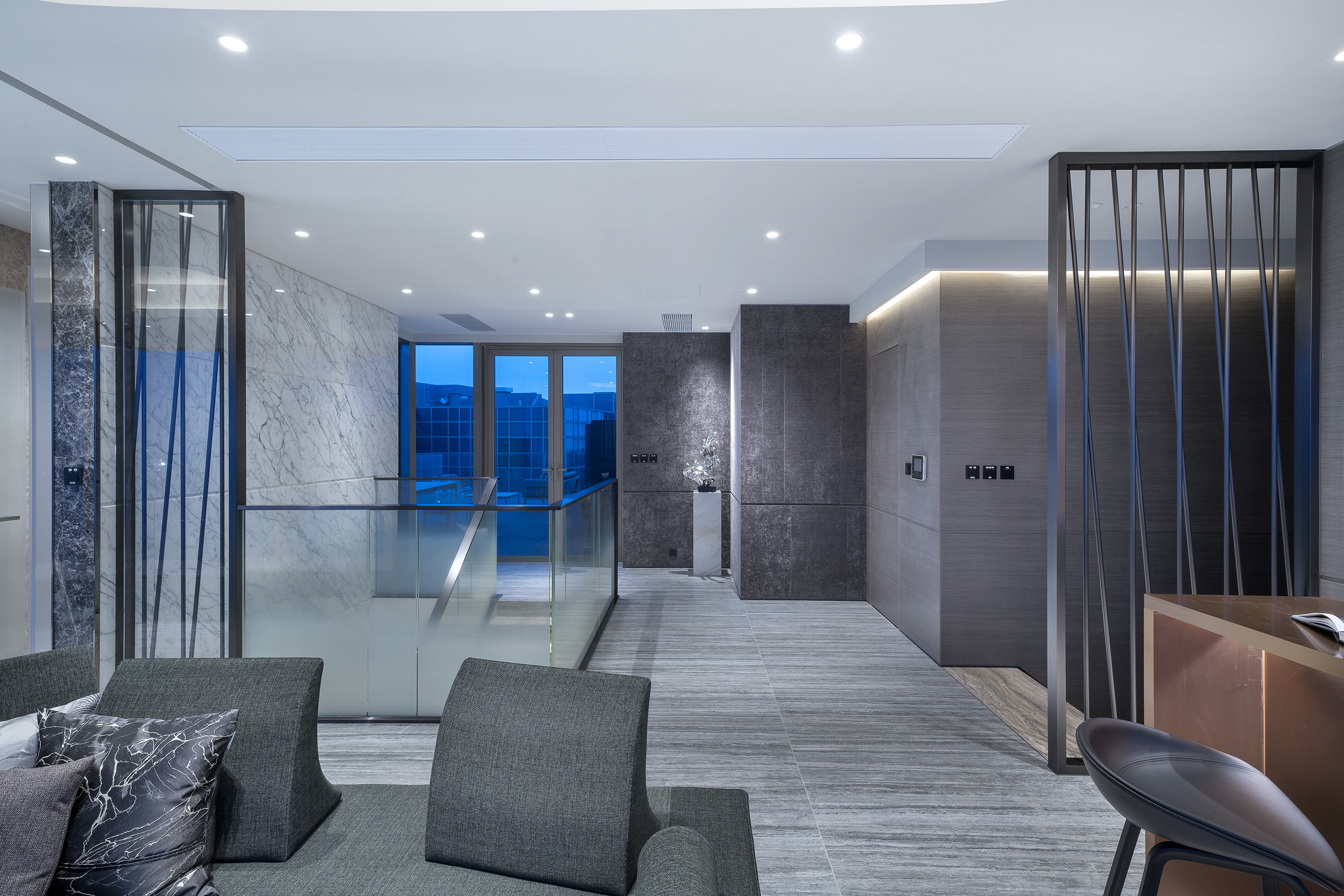 A show-flat project for a young couple living in a nuclear family consists of 4 bedrooms, a gym area, bar area, and an outdoor roof. The unit is designed in a calm and minimal atmosphere with the interior is unified with a gradient of black, white and grey textures in order to merges with the lifestyle to escape the hustle in the midst of city life. Bar area on the second floor is the private spot for the owner to having guests linger in the space. It's designed to refine the existing facilities, recreates an exclusive, sophisticated and luxury details with more subtle yet stylish undertone tones to convey young living in the new form of luxury.