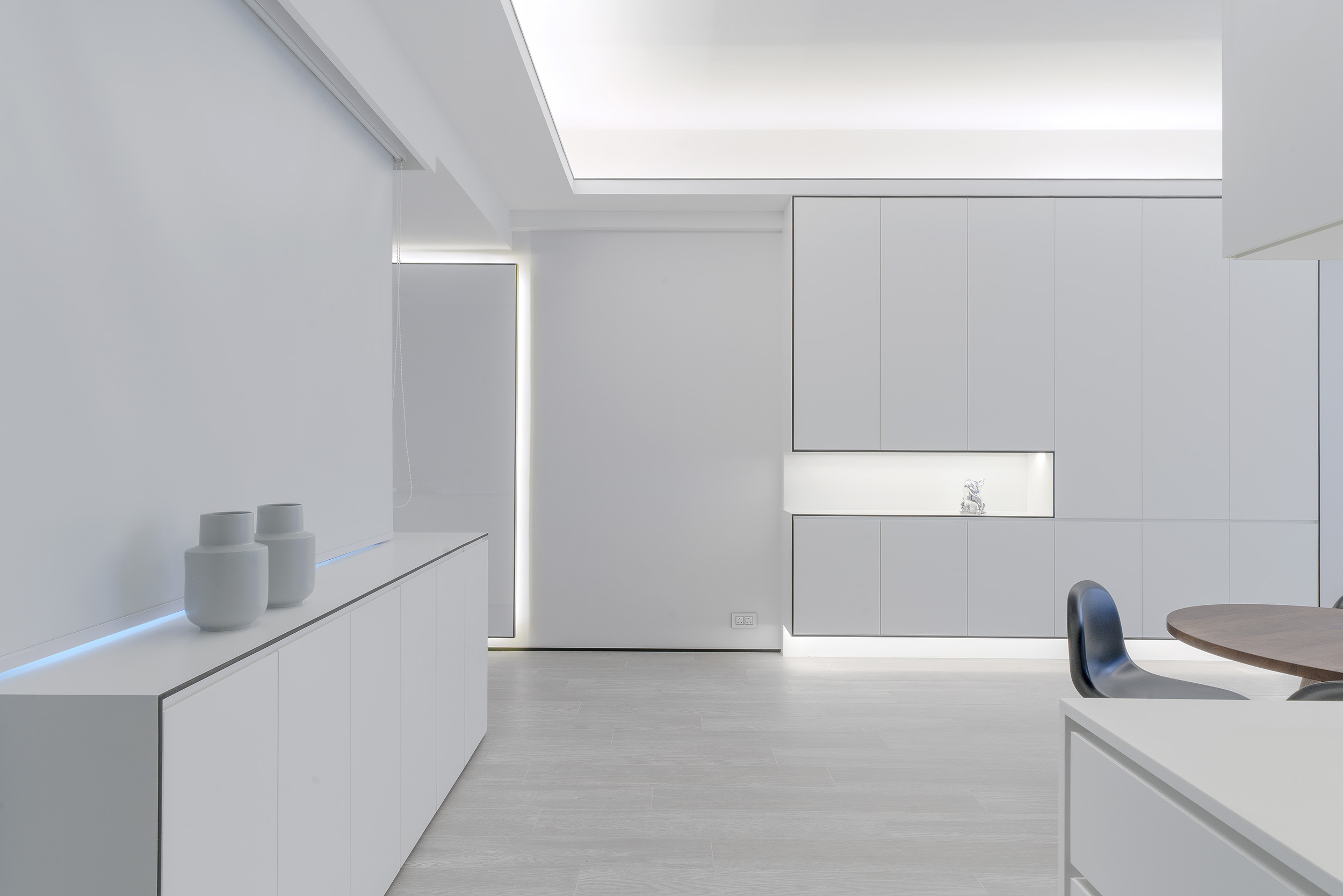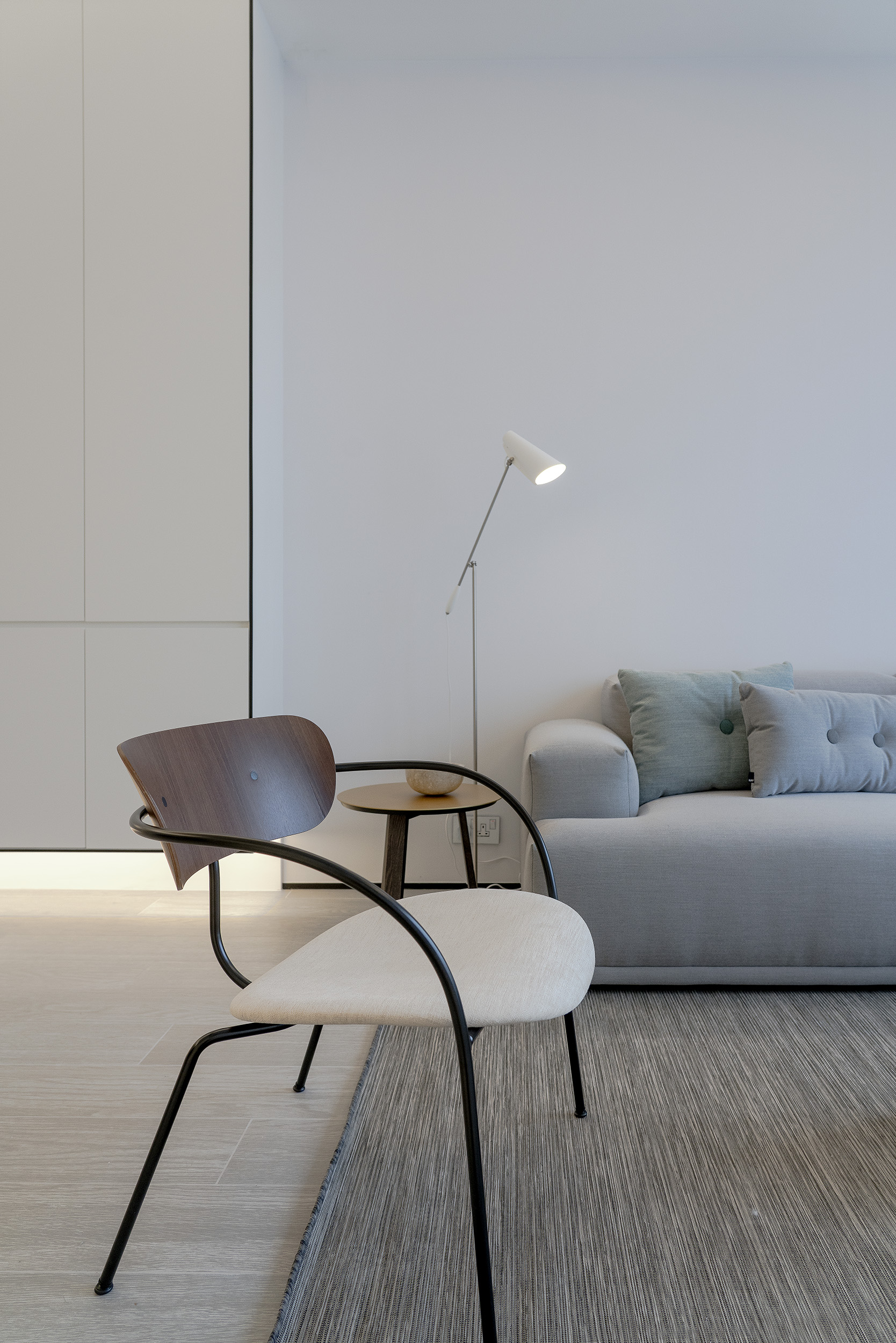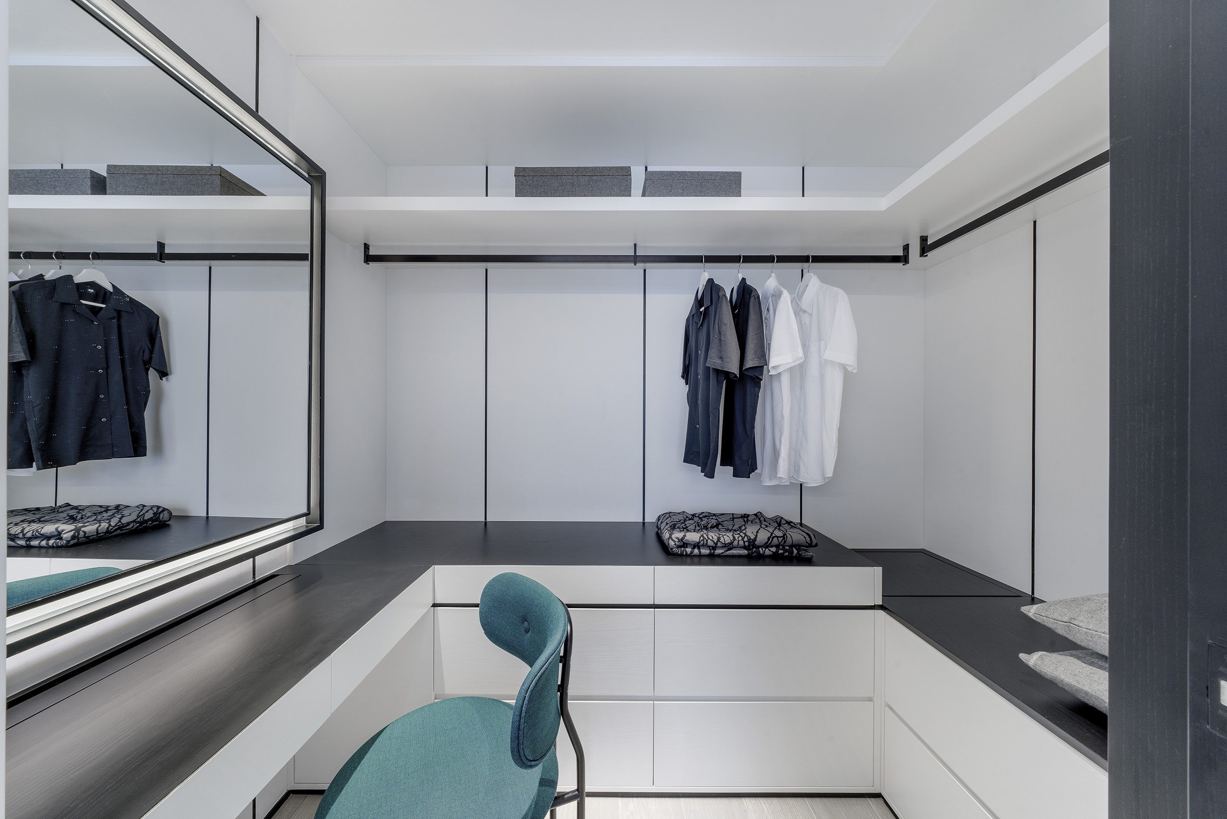 The unit uses pure white tones, ultimate design details with natural materials with minimalist spatial design to create a simple design for the more gentle and pressureless atmosphere. Using black wooden lines around the storage cabinet, ceiling and wall, the contrasting lines look like a frame in different perspectives of the unit, adding a lot of visual impacts and creating a layered effect.