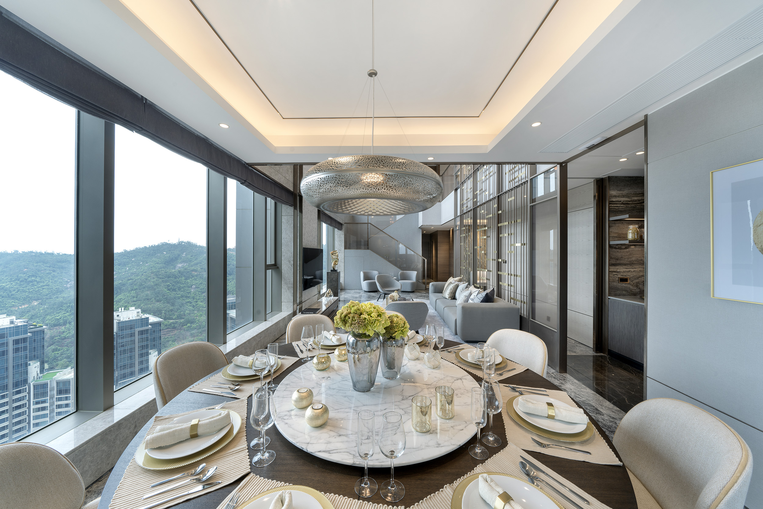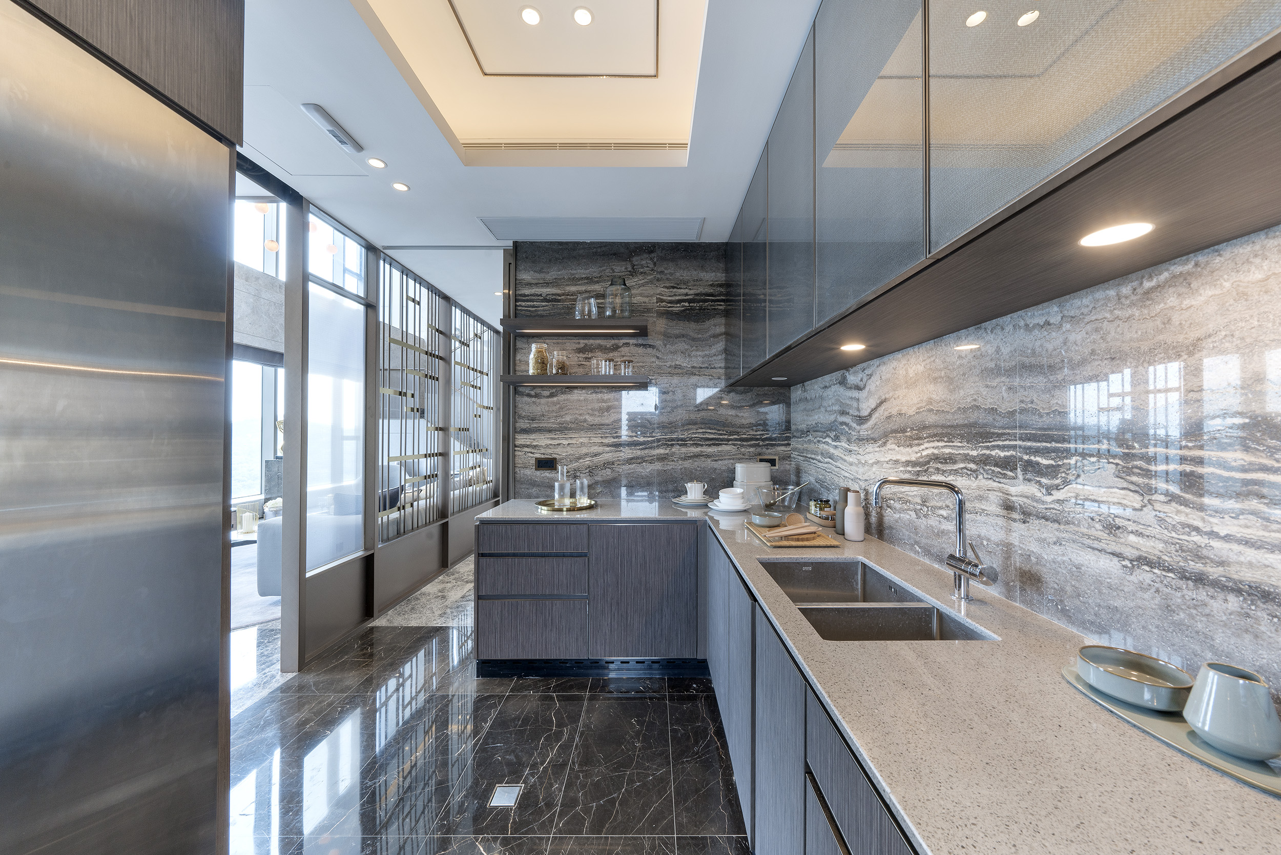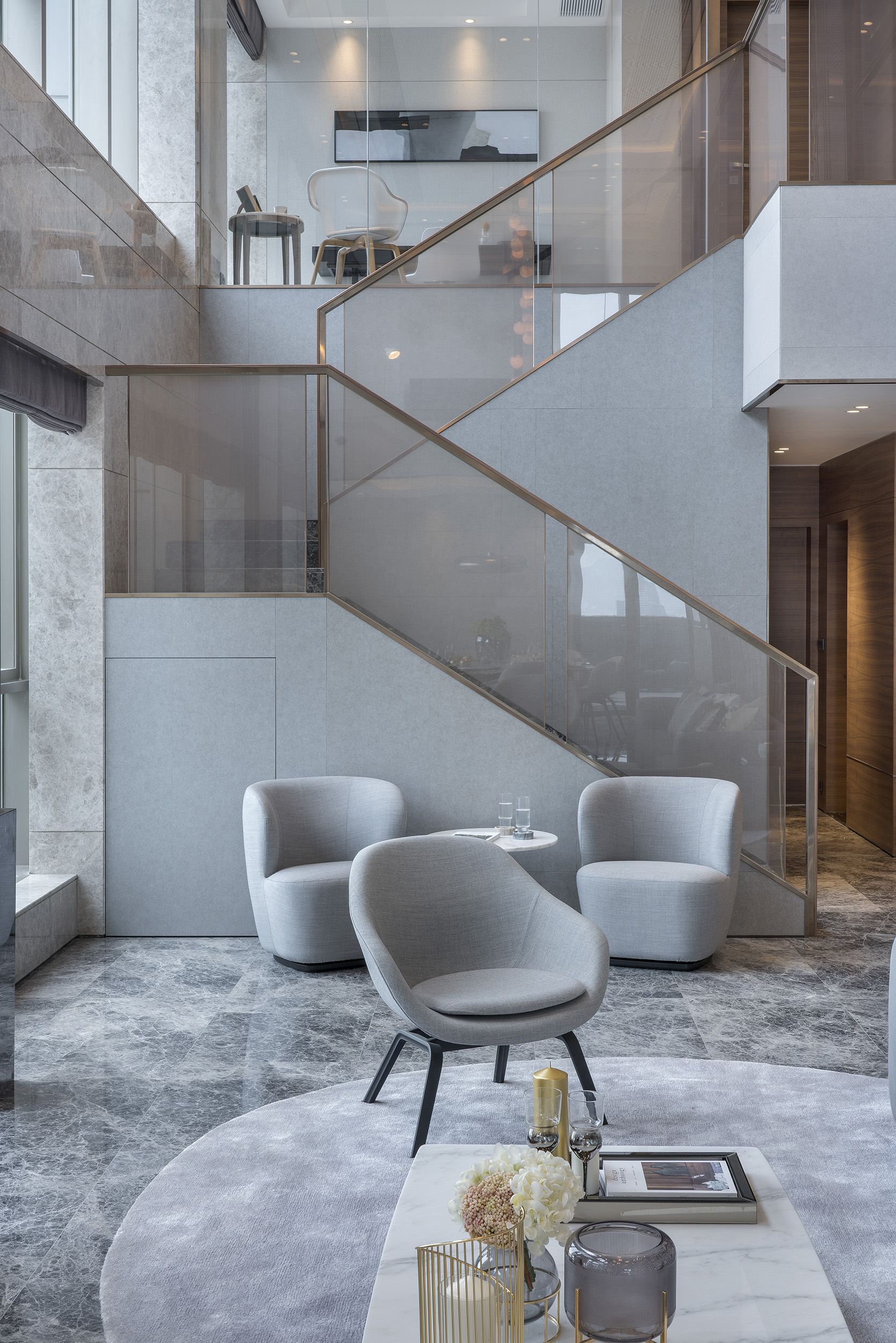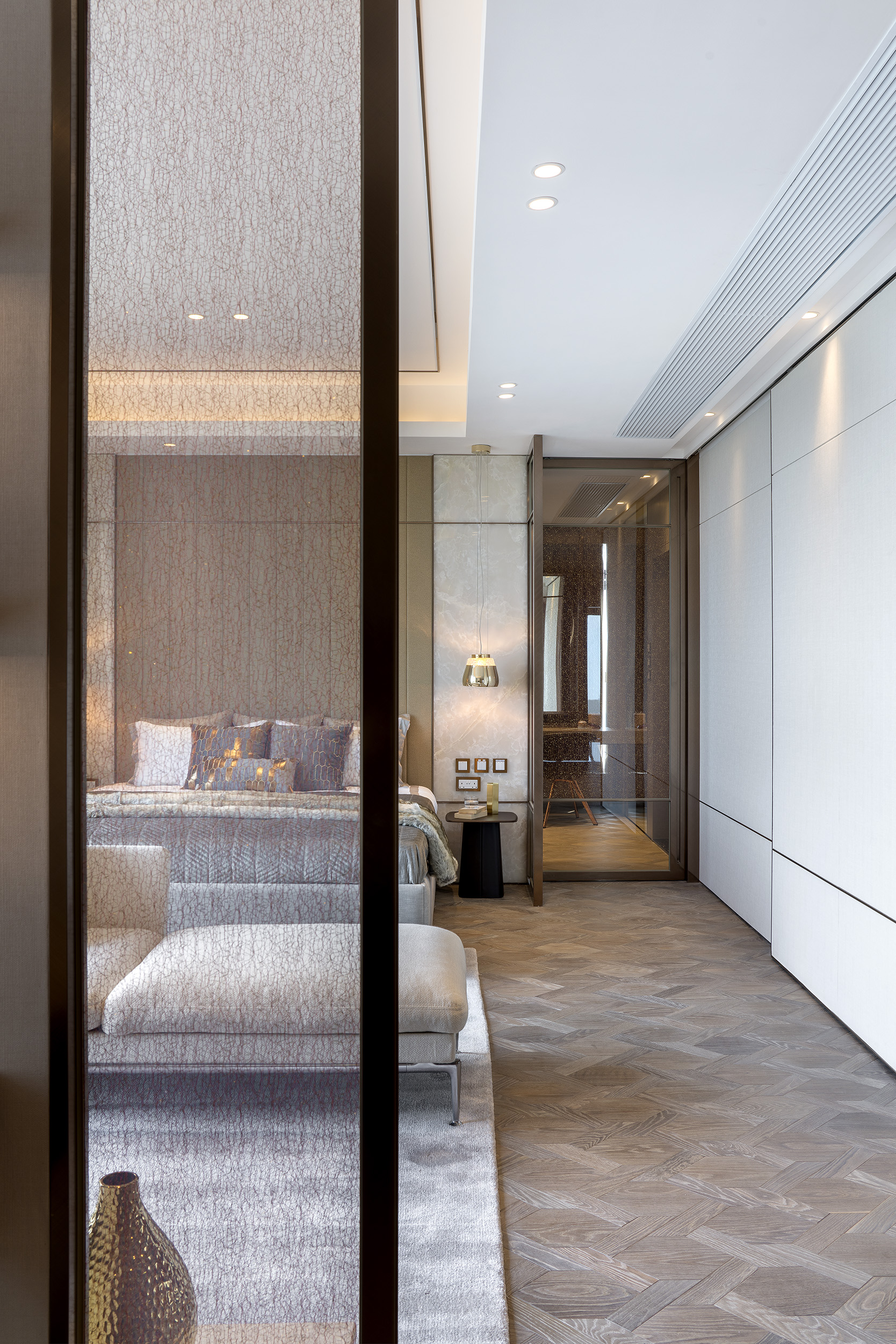 A show-flat project about living in a peaceful surrounding by nature. The design is inspired by the magnificent view of the unit with island, rivers and the sky, we translated the fluidity into a design element in a way not only to capture the movement of the scenic view but also to accentuate the experience of modern luxury in our minimalist yet contemporary spatial language. The show-flat consists of 4 bedrooms, 2 living, and functional rooms. The design and selection of material have transformed the living area into a spacious with decent visual depth via a crisscrossing metal panel & translucent glass to richen the structural feature of the unit.